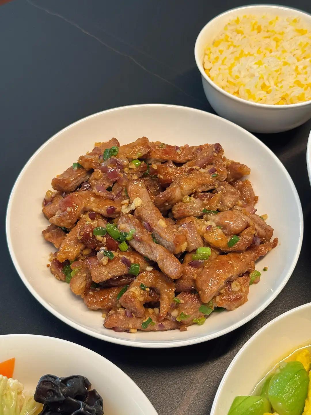 5. 用鍋里底油,爆香蔥白。然后轉大火,倒入煎好的豬排條和蔥綠,快速翻炒幾下,讓蔥香裹滿肉條,沿鍋邊再淋一點點生抽提味,翻炒均勻即可出鍋。