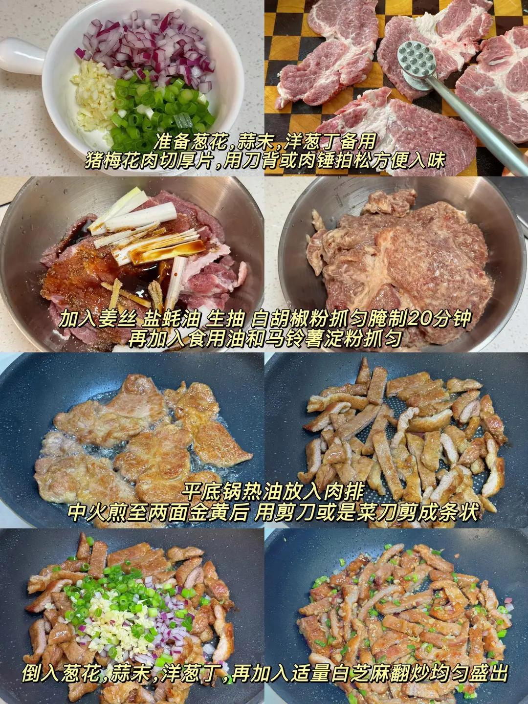關鍵點: 豬排一定要敲松,這是嫩的關鍵。煎的時候火候把握好,別老了。最后和蔥花大火快炒,激發出香氣就立刻出鍋。