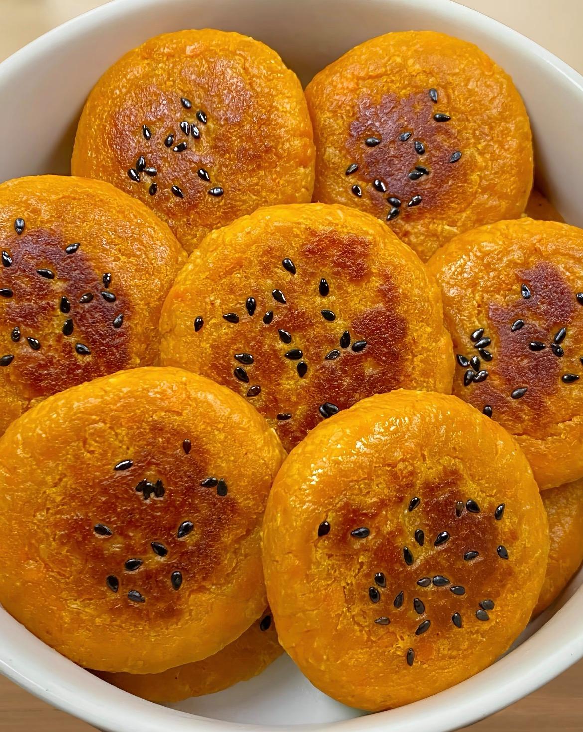 4、平底鍋刷薄薄一層油,放入小餅,小火慢煎至兩面金黃、表面微微酥脆即可。