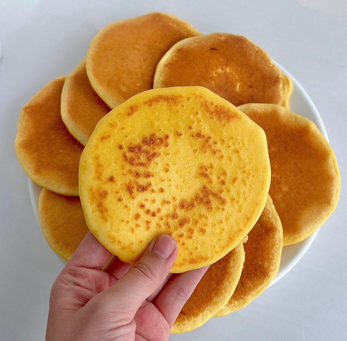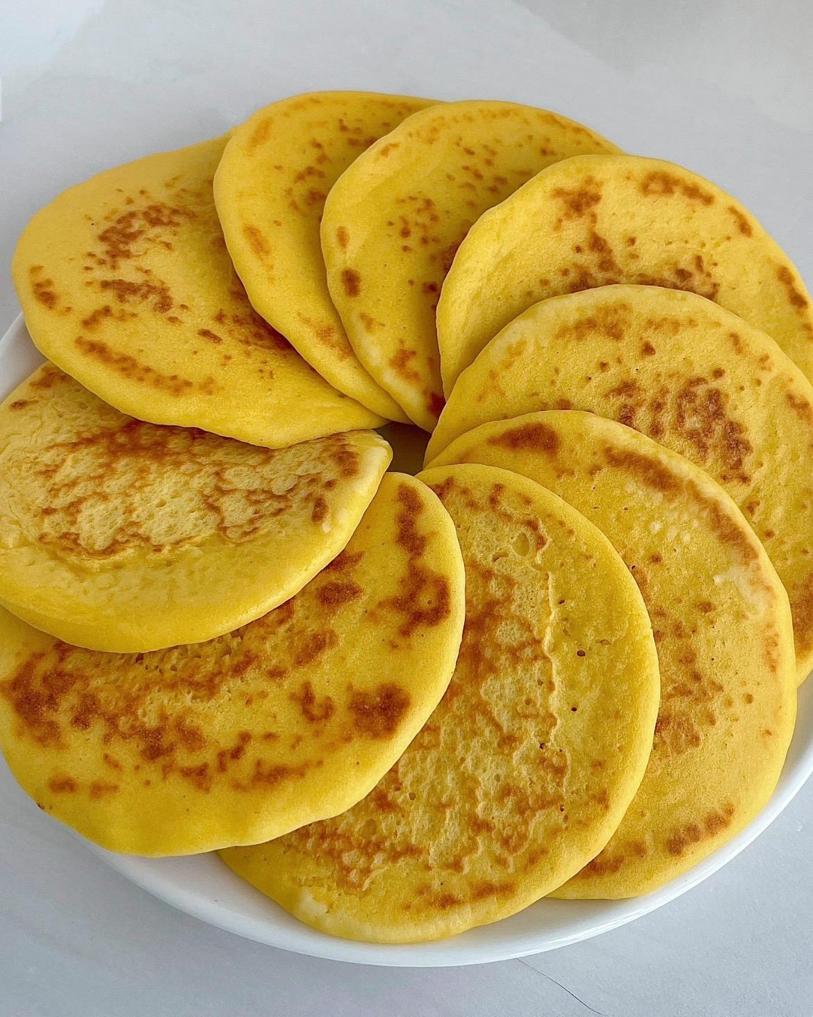 3、平底鍋預(yù)熱(無需放油),用勺子舀一勺面糊倒入鍋中,自然攤成圓餅狀。不要翻動(dòng),小火煎至表面出現(xiàn)密集小氣泡、底部定型。