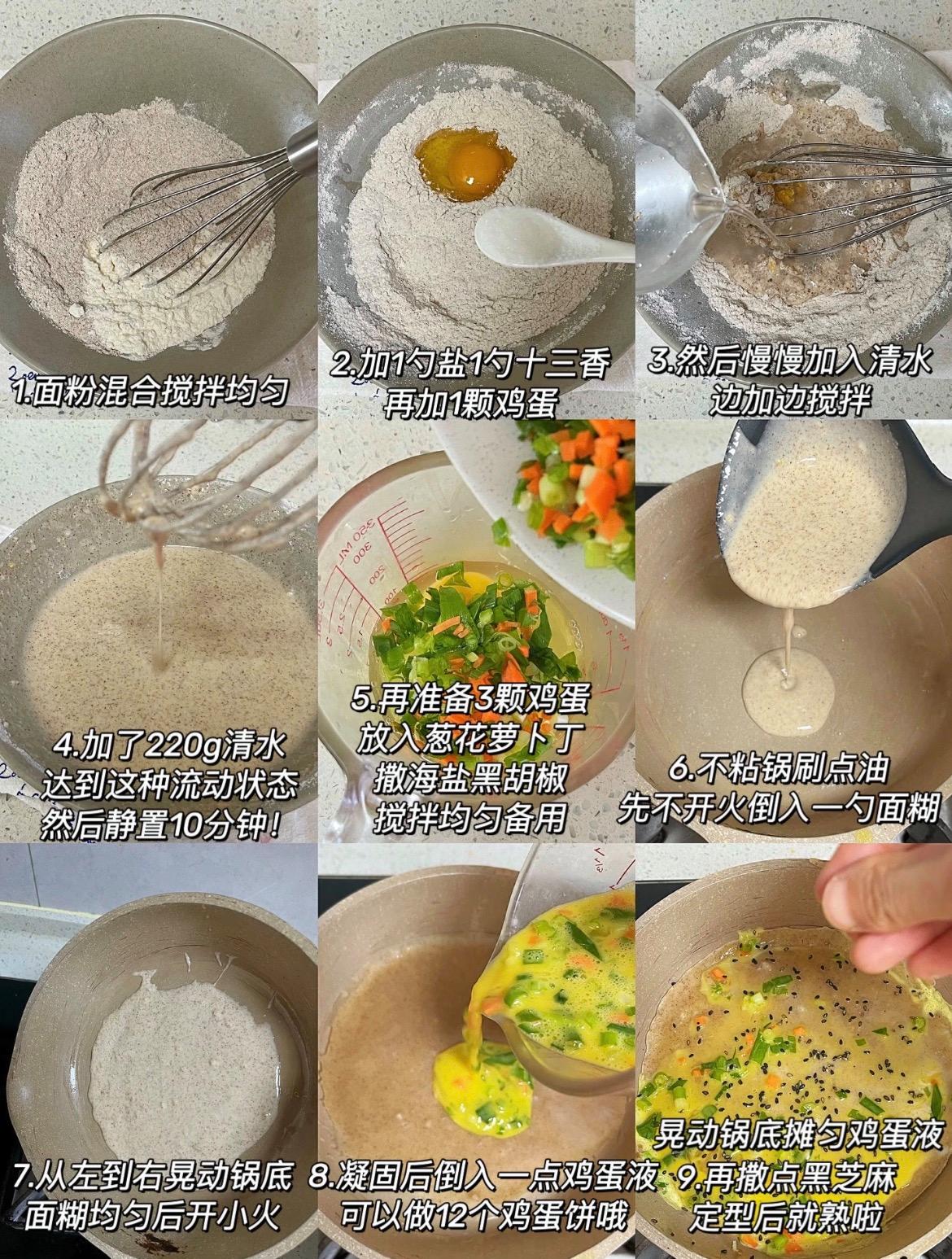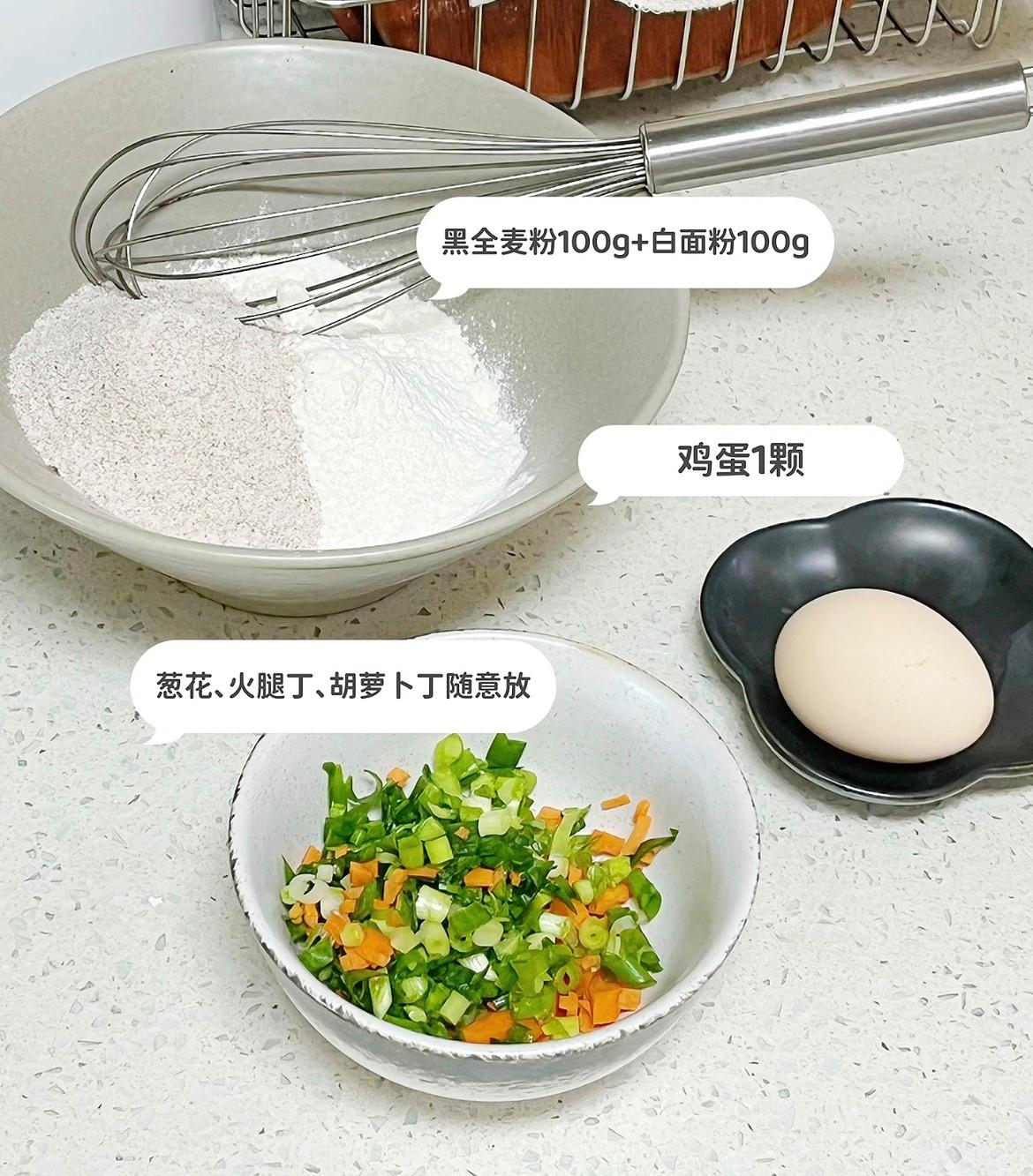 黑全麥粉 100g、白面粉 100g、雞蛋 4顆(1顆放入面糊,3顆備用)、清水 220g左右、鹽、十三香 各1勺、蔥花、火腿丁、胡蘿卜丁 適量、海鹽黑胡椒、黑芝麻 少許、食用油 少許