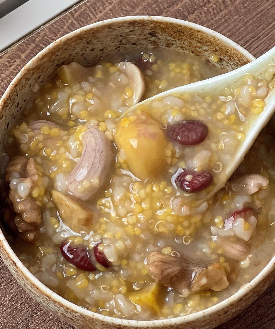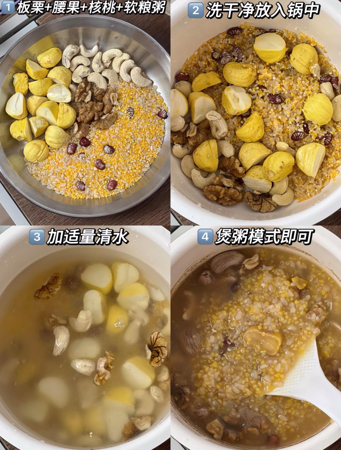板栗 幾顆、腰果 一小把、核桃 一小把、軟糧粥米 適量(如小米、燕麥、玉米、藜麥等混合)、清水 適量