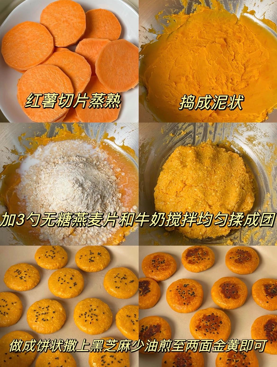 紅薯 1–2個(gè)、無糖燕麥片 3大勺、牛奶 適量、黑芝麻 少許、食用油 少許