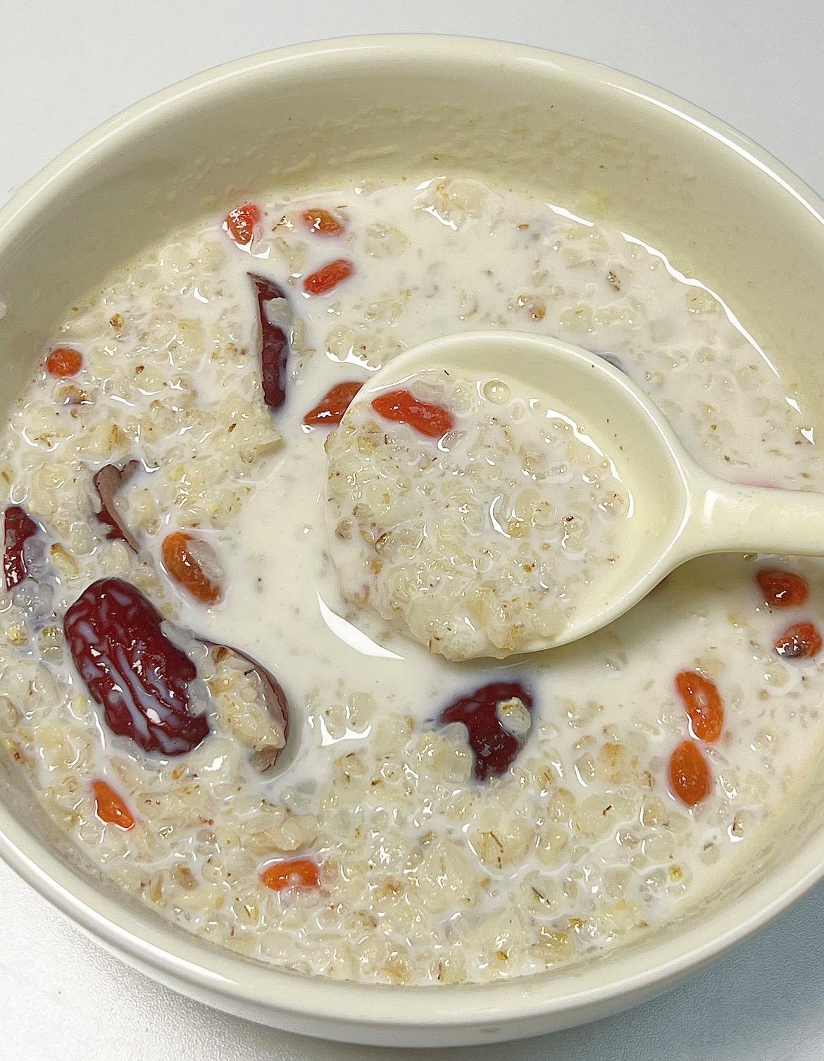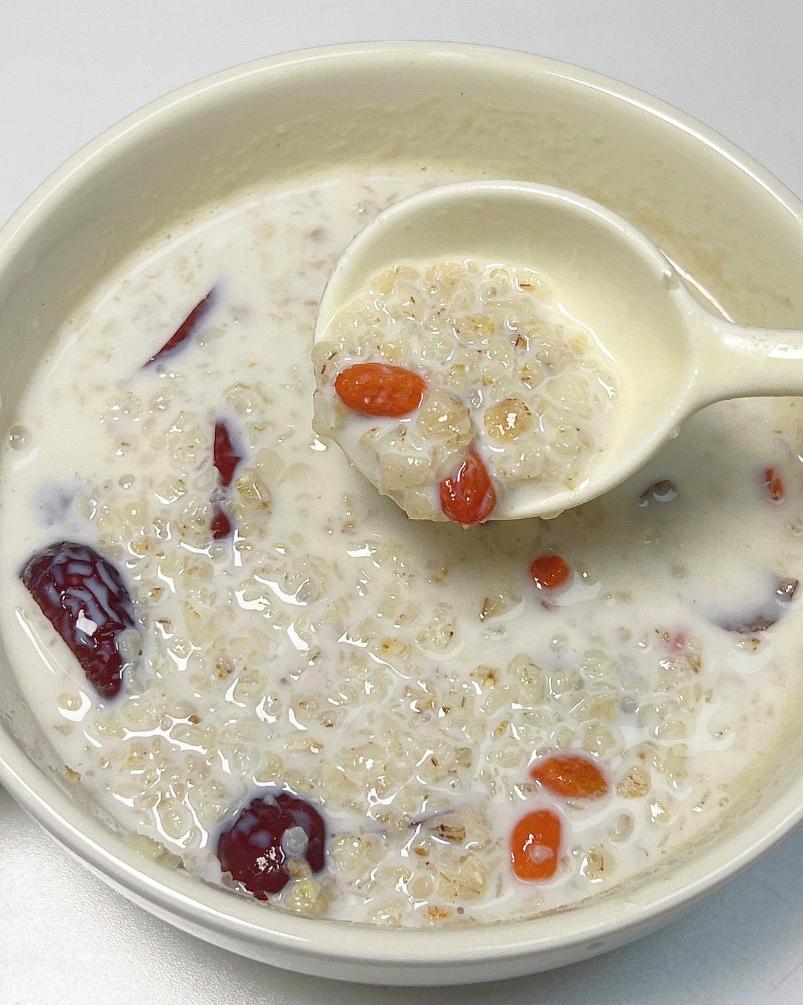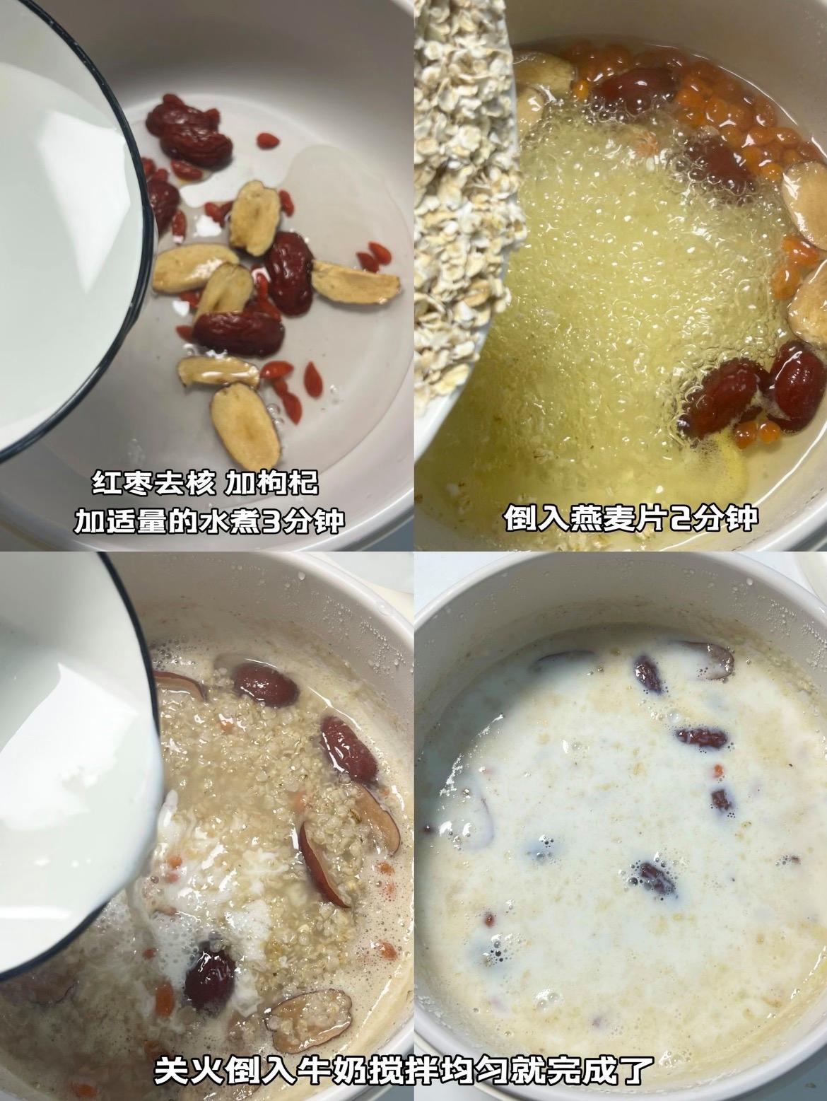 紅棗 幾顆(去核)、枸杞 一小把、燕麥片 適量(快煮或即食型均可)、牛奶 200–250毫升、清水 適量
