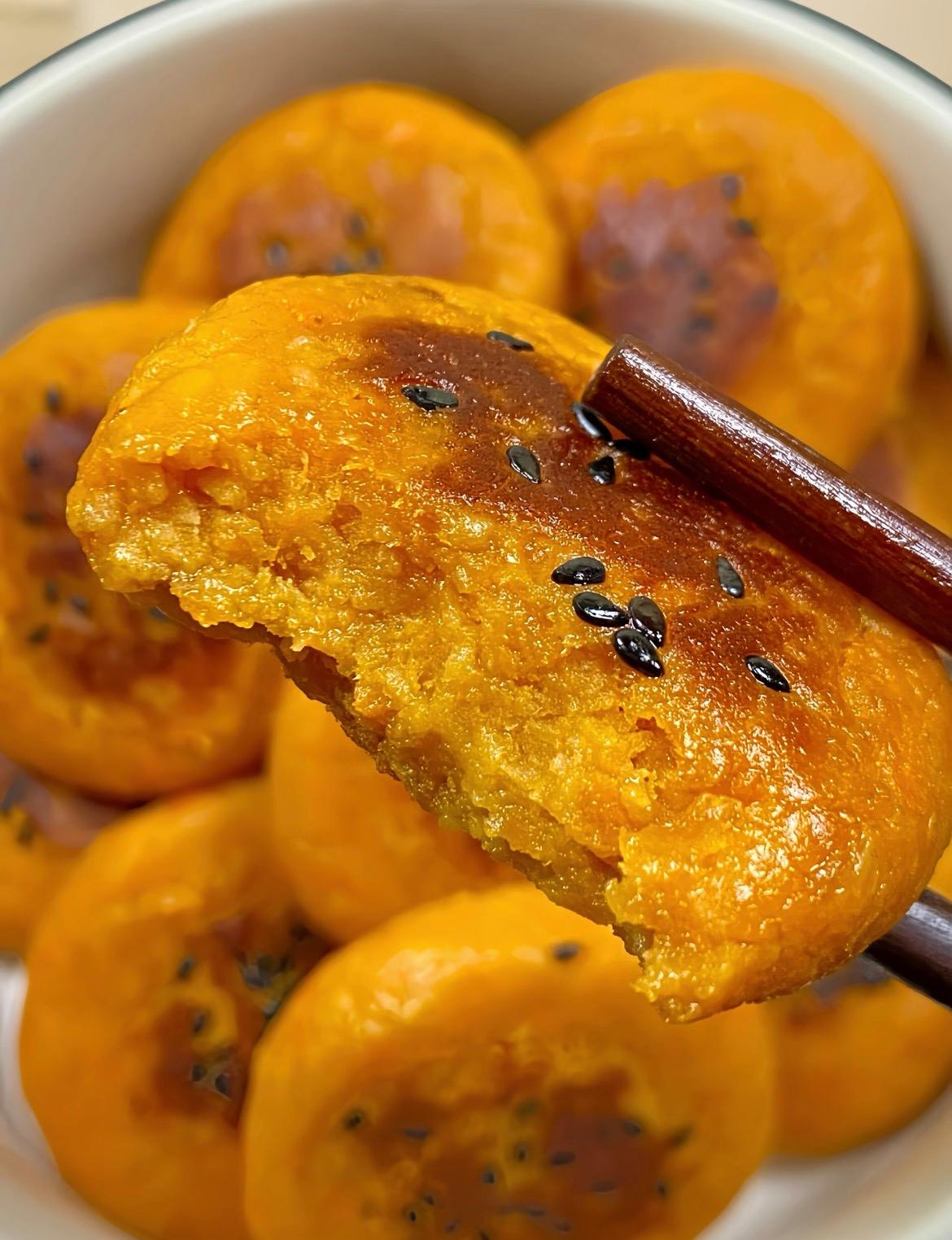 4、用鏟子輕輕翻面,繼續(xù)煎約1–2分鐘,兩面金黃即可出鍋。
