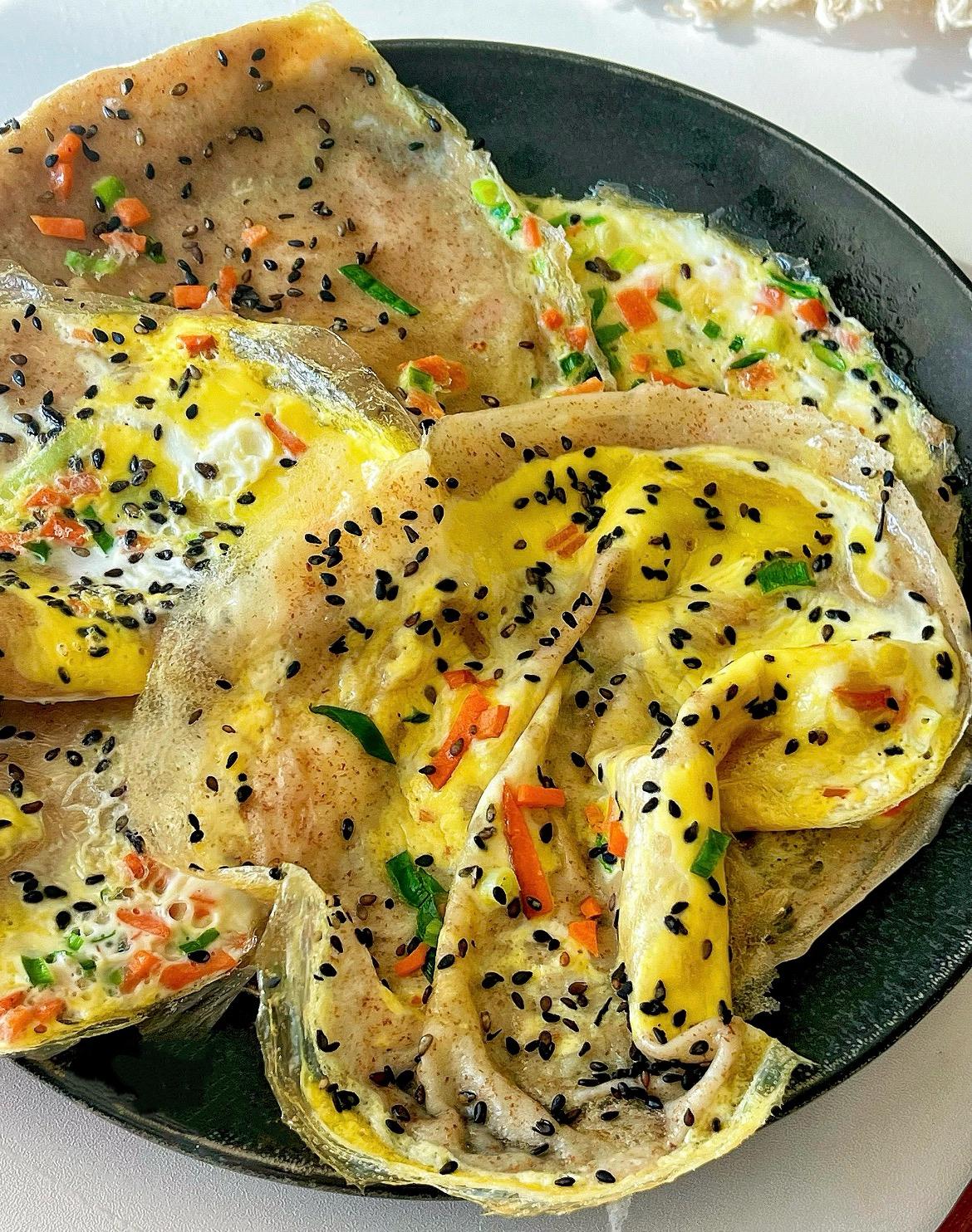 4、開小火,待面糊微微凝固后,倒入適量雞蛋液,撒上黑芝麻,繼續(xù)晃動(dòng)鍋底使蛋液分布均勻。煎至兩面定型、完全熟透即可出鍋。可以卷一些自己喜歡的菜吃。