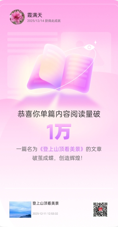 我的作品《登上山頂看美景》單篇閱讀量超過10000了