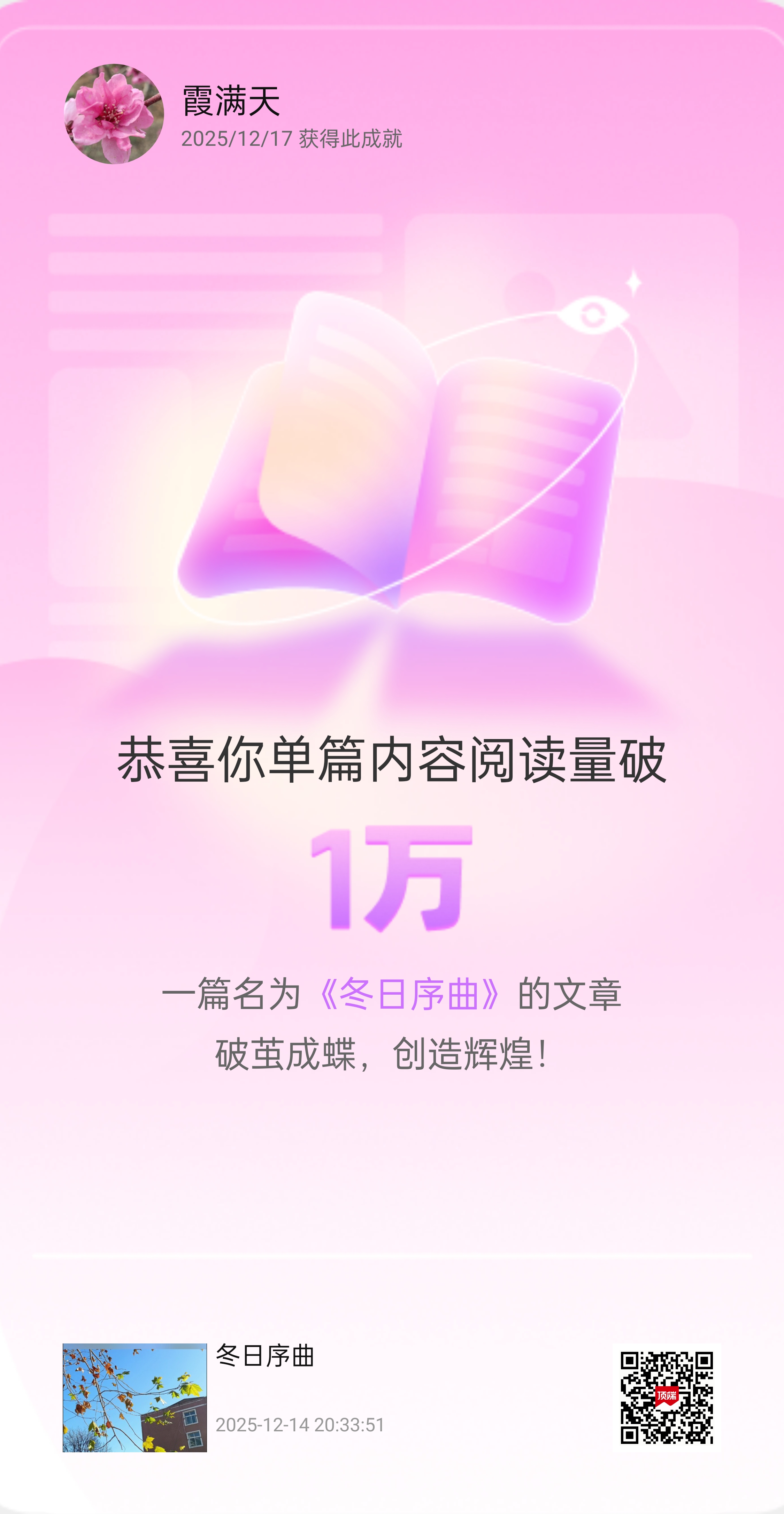 我的作品《冬日序曲》在頂端單篇閱讀量超過10000了。
