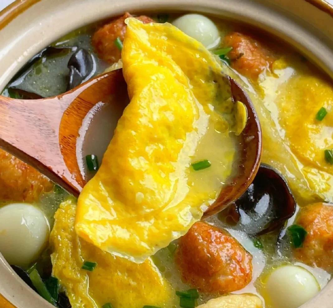 那你可能會說這兩道都是葷菜為主想吃點清淡的、鮮美的一鍋燉能辦到嗎? 當(dāng)然能。 這就不得不提南方特別是江南一帶對“一鍋鮮”的理解。 他們不用濃油赤醬靠的是食材本味的疊加和高湯的提攜。 比如“蛋餃豬皮三鮮鍋”聽起來食材雜味道是清鮮路線。 蛋餃?zhǔn)请u蛋皮裹著肉餡先煎后蒸或煮熟的半成品寓意金元寶過年必備。 炸豬皮就是響皮干貨用水泡發(fā)后變得軟彈滿是孔洞能吸收大量湯汁。 再配上幾只魚丸、肉丸幾顆剝殼的鵪鶉蛋一小把泡發(fā)的黑木耳幾棵小青菜。