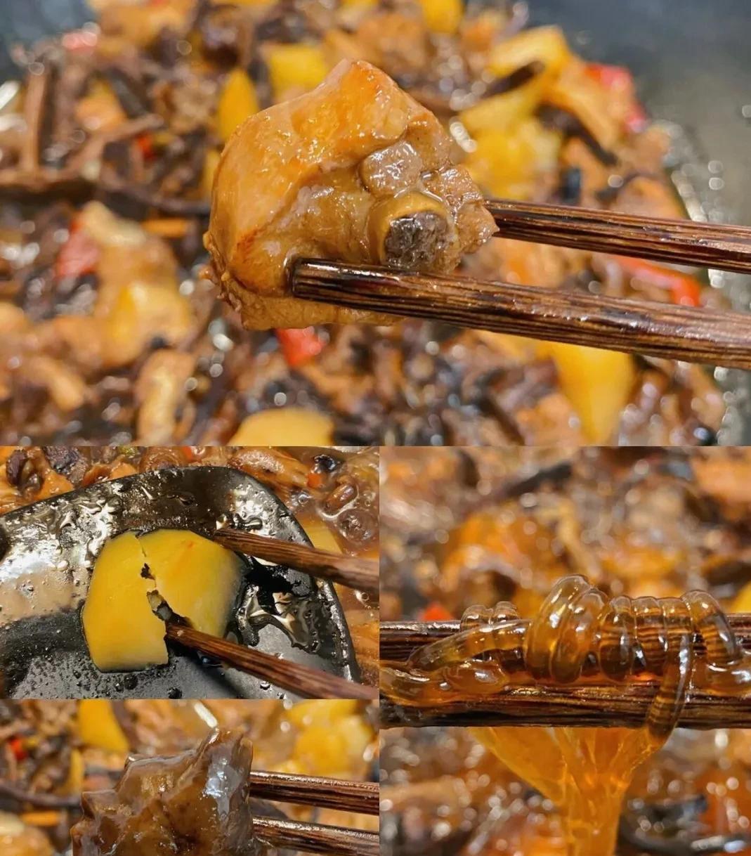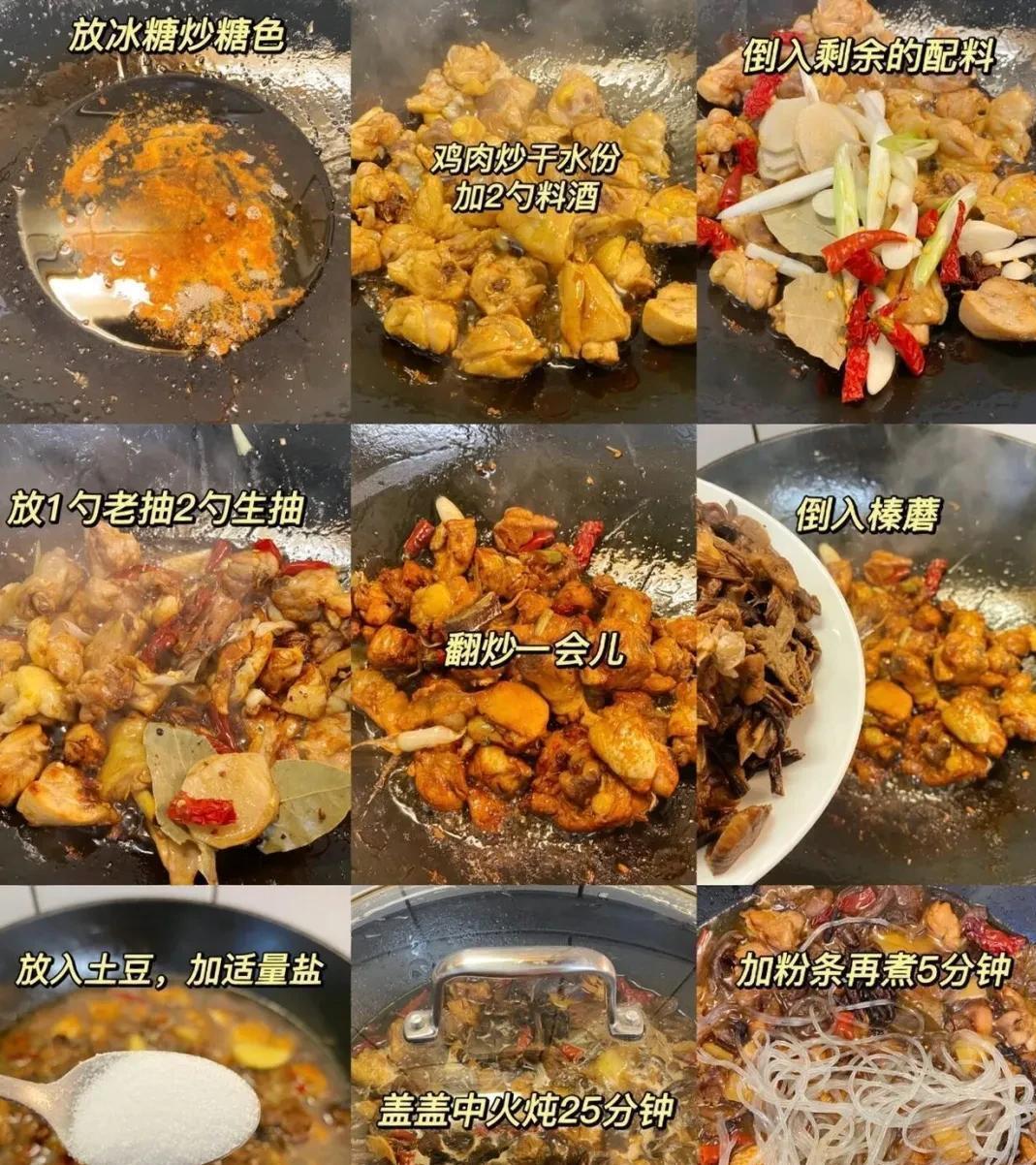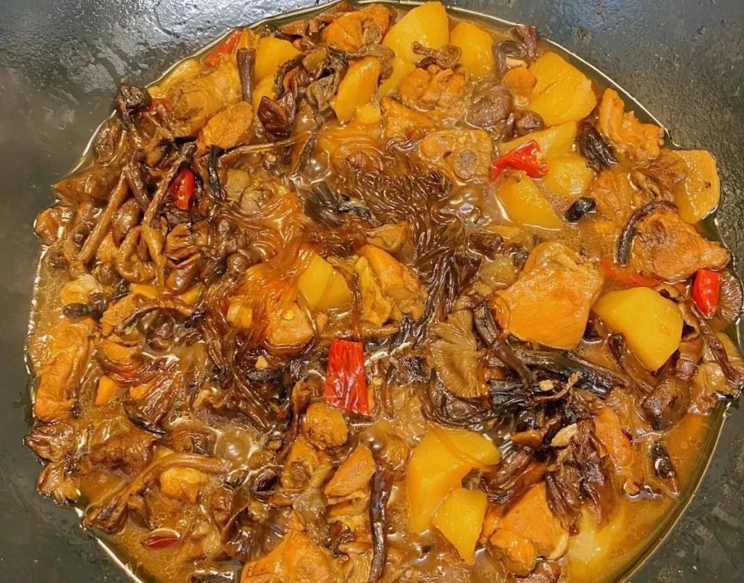 這25分鐘里雞肉的鮮美和油脂榛蘑的濃郁香氣還有各種香料的滋味全部在湯水里交融、滲透。 雞肉變得酥軟還不至于脫骨。 時間快到前可以下點切塊的土豆。 最后五分鐘把泡軟的紅薯粉條鋪在最上面。 粉條熟得快吸味也快。 時間一到開蓋熱氣蒸騰香氣是那種醇厚的、帶著肉感與菌香的復(fù)合味道顏色是誘人的醬黃。 雞肉里有了蘑菇的香蘑菇里飽吸了雞湯的鮮粉條和土豆則成了最受歡迎的配角軟糯入味。 這道菜的味道層次比單純的豬肉燉粉條要復(fù)雜、深厚得多它展現(xiàn)的是一鍋燉的“燉”功是時間賦予的醇厚。