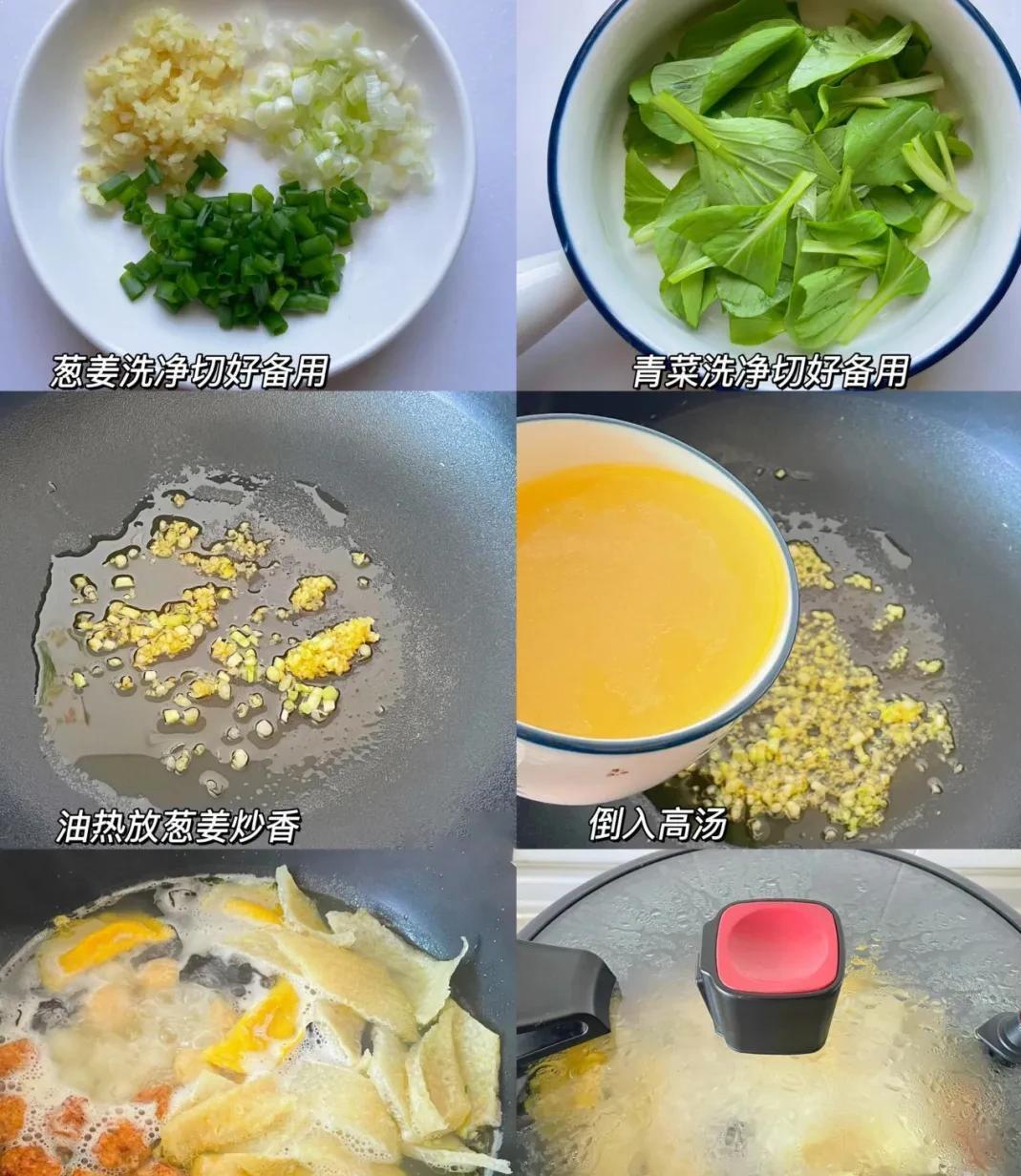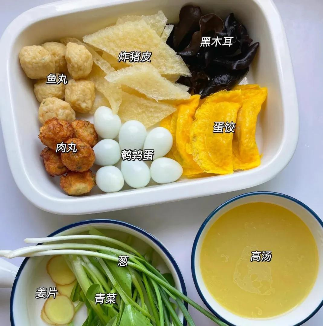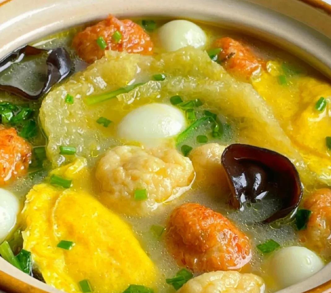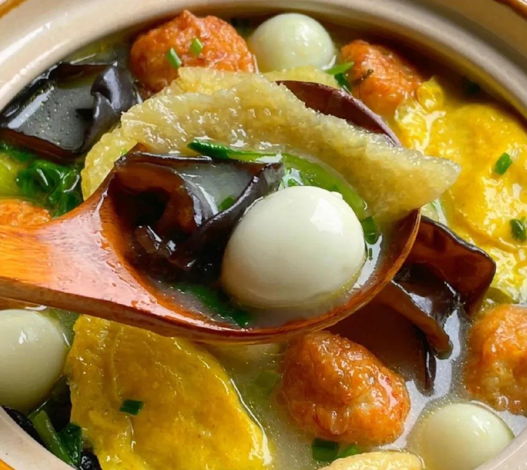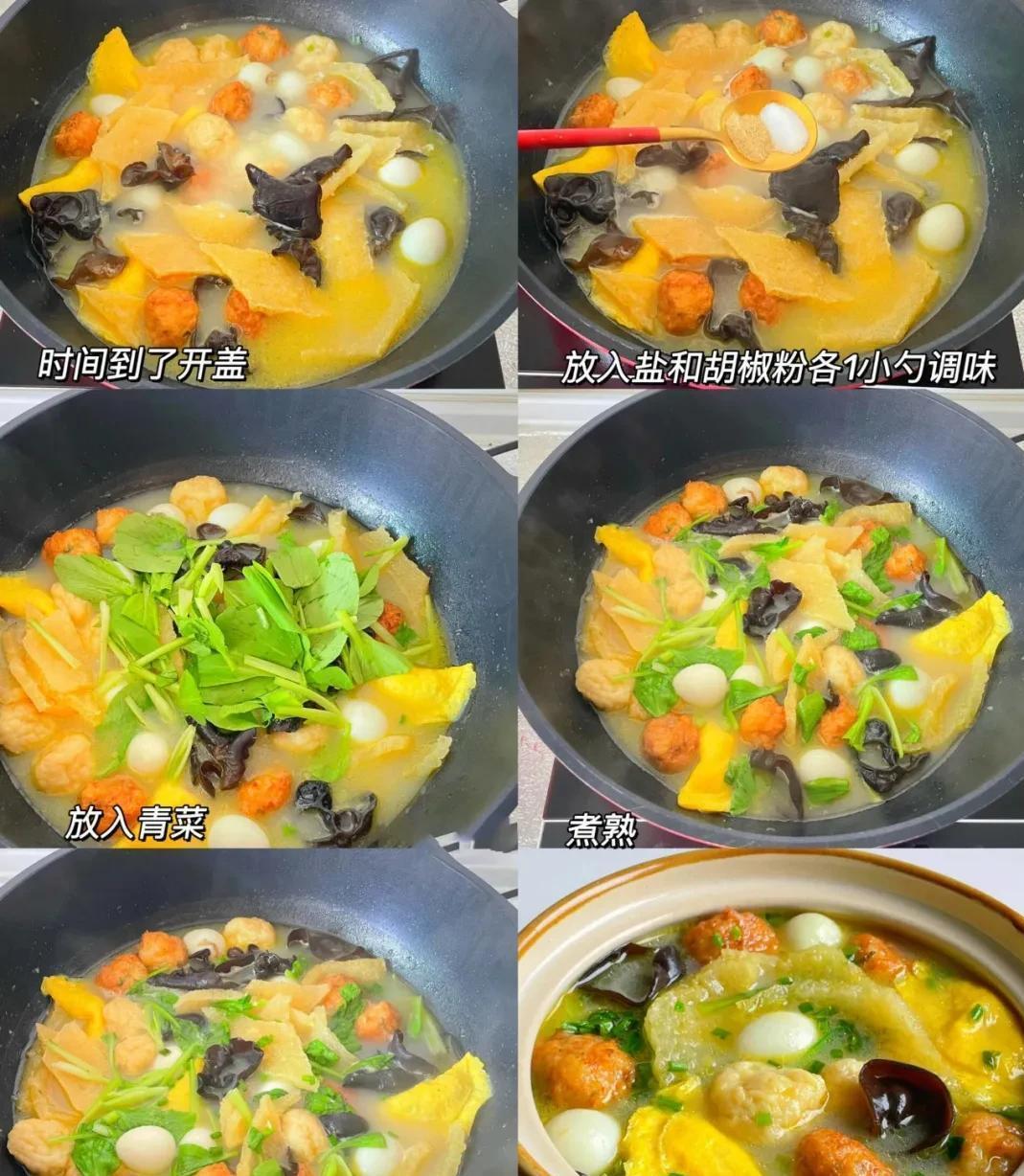 做法就更顯“淡雅”了。 鍋里少許底油爆香姜片和蔥白然后直接倒入提前熬好的高湯可以是雞湯、骨頭湯實在沒有用濃湯寶兌水也行風(fēng)味肯定有差。 湯燒開除了青菜把所有食材:蛋餃、泡軟的炸豬皮、魚丸肉丸、鵪鶉蛋、木耳一股腦兒放進(jìn)去。 大火再次燒開后就轉(zhuǎn)成中小火蓋上蓋子讓它們在微沸的狀態(tài)下“養(yǎng)”著燉上15分鐘左右。 這個過程中蛋餃的蛋香、肉鮮魚丸的鮮甜豬皮的油脂還有木耳的清新全部緩緩釋放到湯里。 湯色會逐漸變得奶白或微黃表面浮著一層誘人的油花。