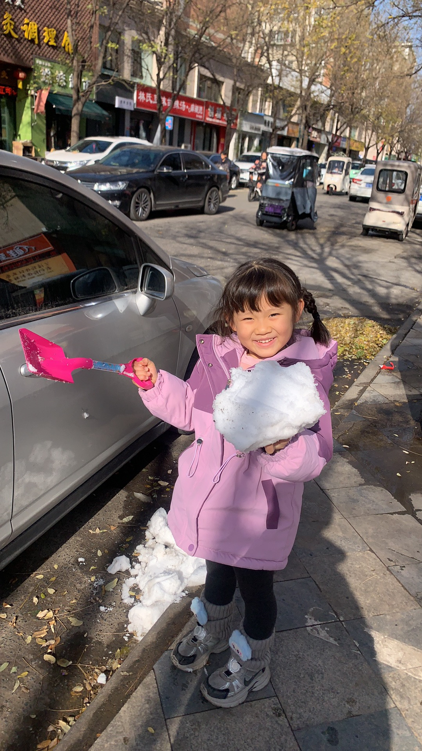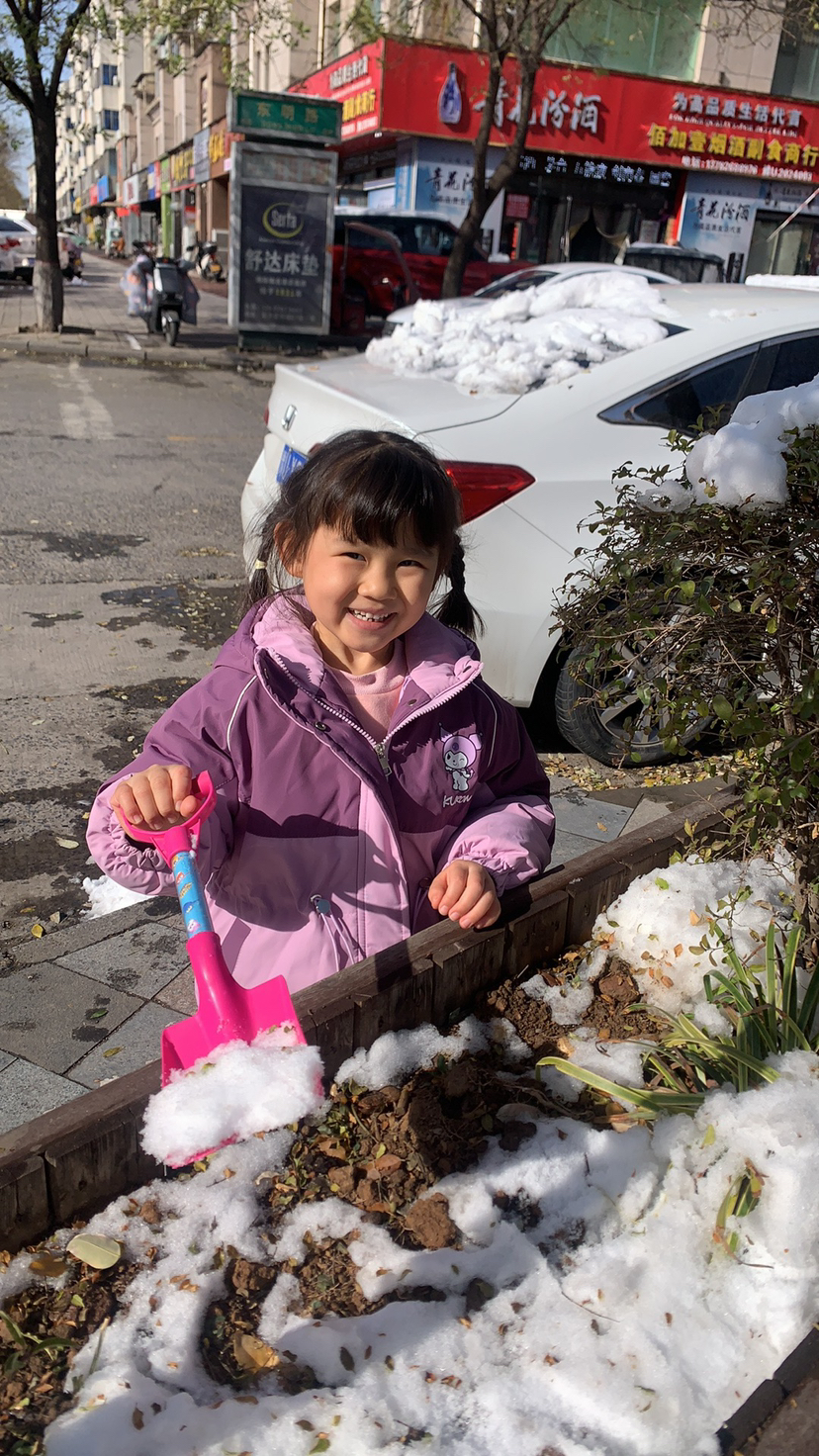 飯后,憋了一上午的小寶貝拎著小鏟子,吵著要去玩雪。昨天的雪下得紛紛揚揚,可氣溫不算太低,馬路上的積雪早已化成濕漉漉的水漬,只剩背陰處和車頂還積著厚厚一層。我幫她扒拉下一堆雪,孩子立刻興奮地忙活起來:一會兒用鏟子堆出歪歪扭扭的小雪人,一會兒干脆扔了鏟子徒手抓雪,凍得通紅的小手攥著雪團,還在雪堆上插滿小樹枝,說是"種梅花"。看著她鼻尖沾著雪沫子的純粹笑容,我也忍不住蹲下身,陪她一起扒雪、堆造型,兒時在鄉下玩雪的記憶涌上心頭。在喧囂的市區里,這一刻的心境竟如白雪般純凈無瑕,滿是無憂無慮的自在。