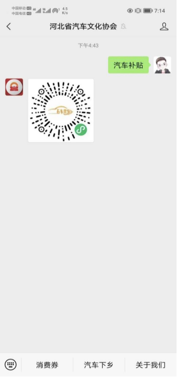 領取購車補貼通道二:打開微信,關注“河北省汽車文化協會”公眾號,回復“汽車補貼”,自動彈出“石車秀車網”小程序二維碼,長按識別二維碼,進入“石車秀車網”小程序,在首頁上點擊“橋西區汽車促消費補貼領取入口”。