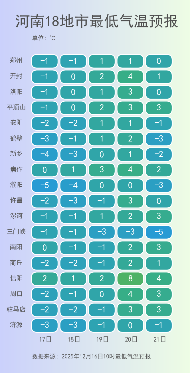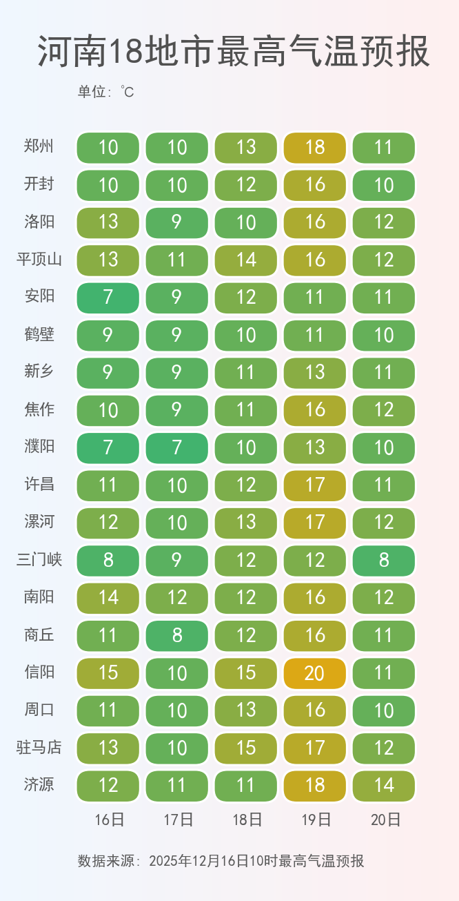 16日~19日,河南大部將維持晴天或多云。周五,河南多地午后氣溫升至15℃~18℃,信陽(yáng)等地甚至超過(guò)20℃。但周末,一股強(qiáng)冷空氣抵達(dá)河南,多地最高氣溫累計(jì)降幅達(dá)10℃左右。伴隨著氣溫跳水,黃河以南多地預(yù)計(jì)會(huì)再次迎來(lái)雨雪天氣。