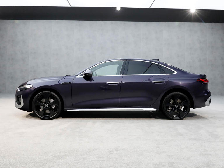 再來看車身側面部分,車身側面采用溜背式轎跑設計,流暢的腰線從車頭貫穿至車尾,配合無框車門與鍍鉻窗框,營造出優雅而動感的視覺效果。軸距達2969mm,車長4908mm,既保證了后排乘客的腿部空間,又通過短前懸、長后懸的設計,實現了50:50的黃金比例。19英寸雙五輻式輪轂采用低風阻設計,進一步提升了整車的運動感。尺寸方面,車身延續 4908mm×1860mm×1458mm 的修長尺寸,2969mm 超長軸距確保空間優勢的同時,溜背曲線未顯臃腫。側面最引人注目的是機械 + 電子雙保險半隱藏式門把手,日常使用便捷,遇故障可手動開啟,兼顧科技感與安全性。
