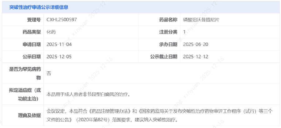 12月15日,康哲藥業(yè)宣布,旗下德鎂醫(yī)藥擁有相關(guān)許可權(quán)利的創(chuàng)新口服JAK1抑制劑povorcitinib(擬定中文通用名:磷酸泊沃昔替尼片)已獲中國(guó)國(guó)家藥品監(jiān)督管理局(NMPA)藥品審評(píng)中心(CDE)批準(zhǔn)納入突破性治療品種,擬定適應(yīng)癥為成人患者非節(jié)段型白癜風(fēng)。