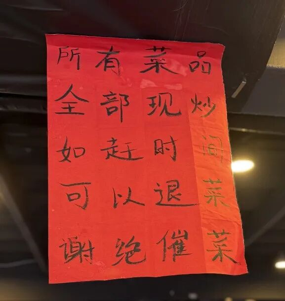 但如果它寫的是:所有菜品現(xiàn)炒,拒絕預(yù)制菜,請耐心等待
