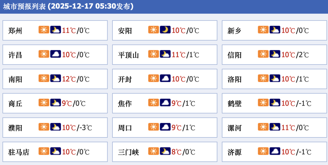 據河南氣象,今天白天到夜里,全省晴天間多云,北中部有輕到中度霾。全省偏北風轉偏南風2到3級。最高氣溫:全省10到12℃。
