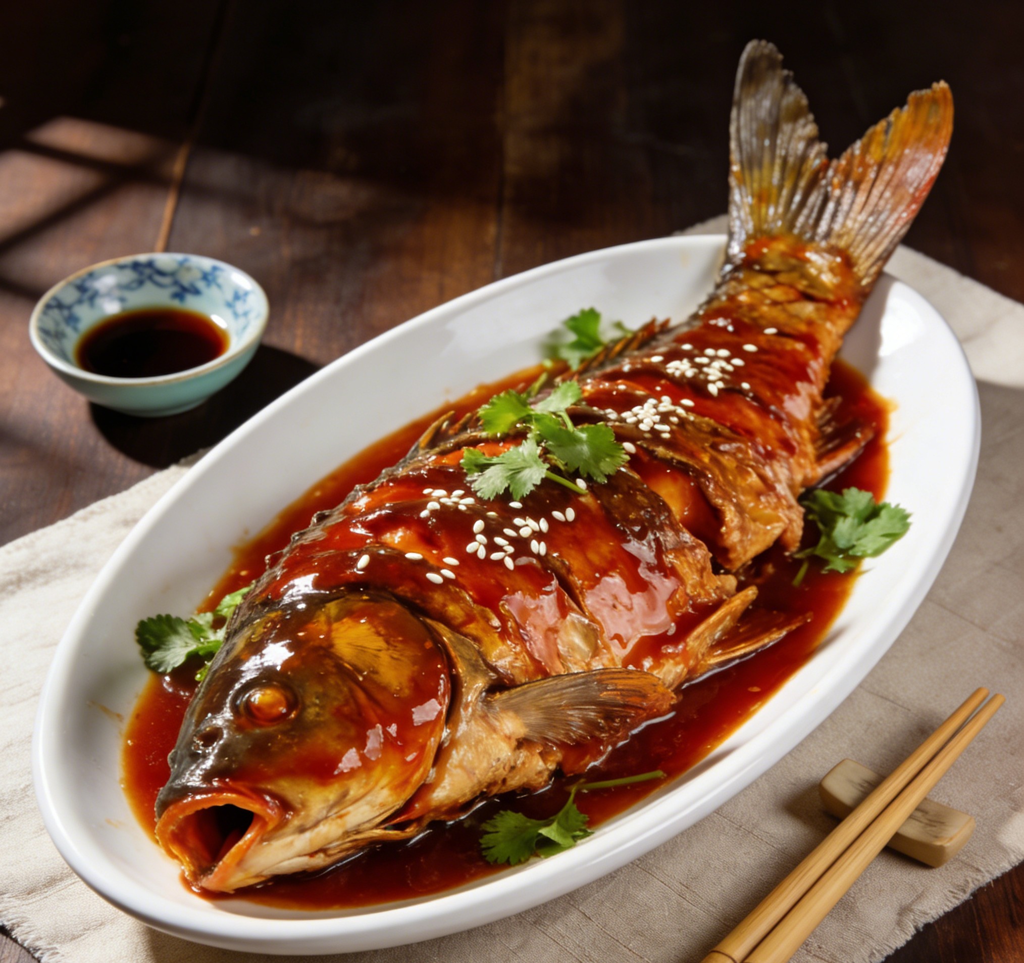 3. 淋汁出鍋:將熬好的糖醋汁均勻淋在炸好的鯉魚身上,撒上香菜段和胡蘿卜絲裝飾,一道正宗的糖醋黃河大鯉魚就做好了。