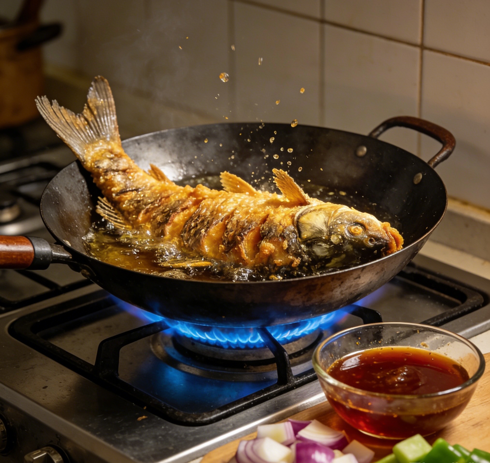 2. 初次油炸:將掛好糊的鯉魚輕輕放入鍋中,用勺子舀起熱油,不斷澆在魚身上(尤其是魚身凸起的部位),讓魚肉均勻受熱。炸至魚身定型、表面呈淡黃色時,撈出控油,靜置3分鐘(這一步稱為“復炸前的醒魚”,可讓魚肉內部熟透,避免外焦里生);