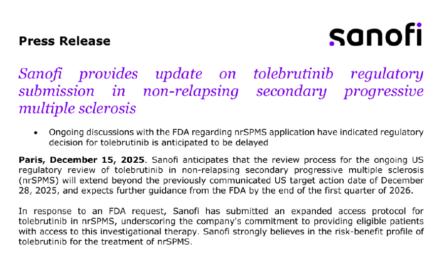 今年3月,賽諾菲向FDA遞交了Tolebrutinib用于治療nrSPMS并延緩成人患者獨立于復發(fā)活動的殘疾進展的NDA,當時確認的PDUFA日期為2025年9月28日。今年9月,由于賽諾菲在審評期間遞交了補充分析資料,這些資料屬于重大修訂(major amendment),為此FDA將PDUFA日期推后了3個月。今日,F(xiàn)DA將審評時限再度延期一個季度。根據(jù)FDA的要求,賽諾菲已經提交了新的資料。