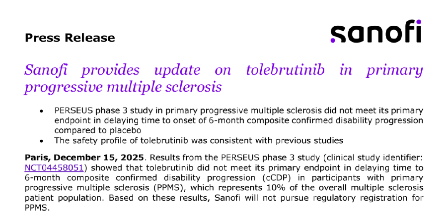 12月15日,賽諾菲宣布了Tolebrutinib的兩個最新進展:針對原發(fā)性進展型多發(fā)性硬化癥(PPMS)的III期PERSEUS研究未達主要終點;針對非復發(fā)性繼發(fā)進展型多發(fā)性硬化癥(nrSPMS)的新藥申請(NDA)審評時限再度延期。