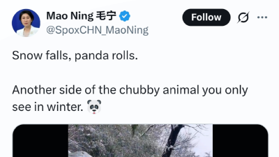 外交部發言人毛寧分享大熊貓靈巖滑雪視頻