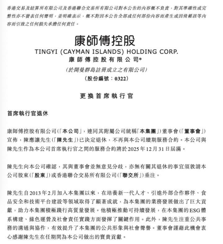 12月18日,康師傅控股有限公司(0322.HK)在港交所發(fā)布公告,現(xiàn)任首席執(zhí)行官陳應(yīng)讓將于2025年12月31日服務(wù)合約屆滿后退休,董事會委任執(zhí)行董事、康師傅飲品控股有限公司董事長魏宏丞于2026年1月1日起接任CEO。