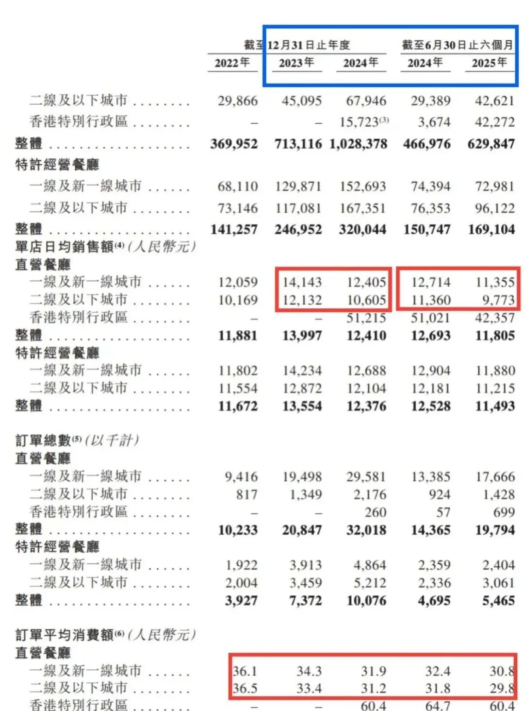 訂單平均消費額從2022年的36元降至2024年的31.8元,降價幅度達11.7%。今年上半年,其直營及加盟店的整體翻座率為僅為3.4及3.1,低于上年同期的3.8及3.6。