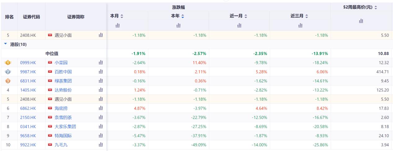 同花順數據顯示,今年以來,港股市場餐飲板塊表現疲軟,部分頭部餐飲企業股價持續下跌,市場對餐飲股的信心不足。