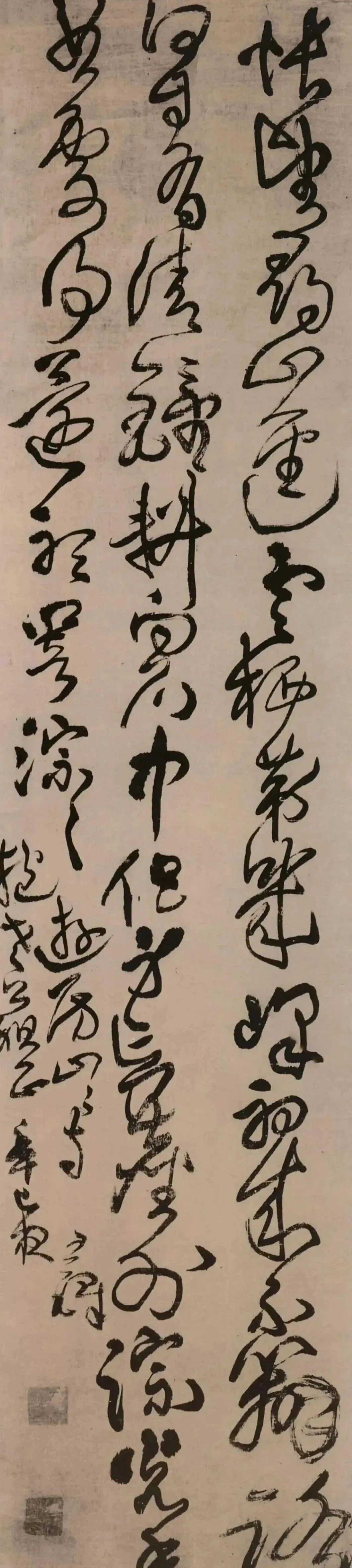 他通常是飽蘸濃墨,起筆書寫,開始的幾個字墨色飽滿,線條厚重,甚至會有“漲墨”效果——墨在紙上微微洇開,形成塊面感-5。寫到后面,筆里的墨漸漸少了,線條開始出現飛白,變得干澀蒼勁-6。