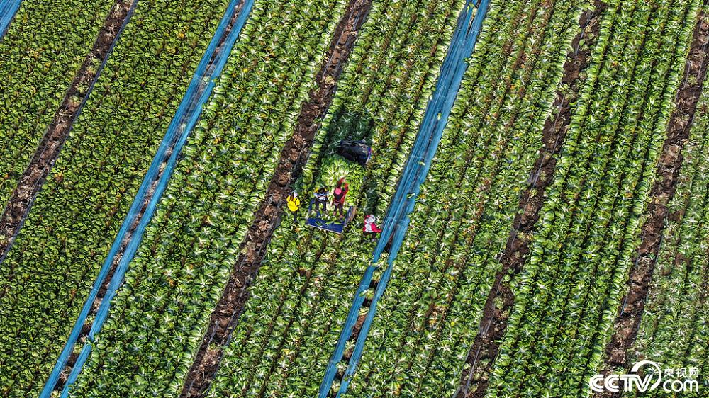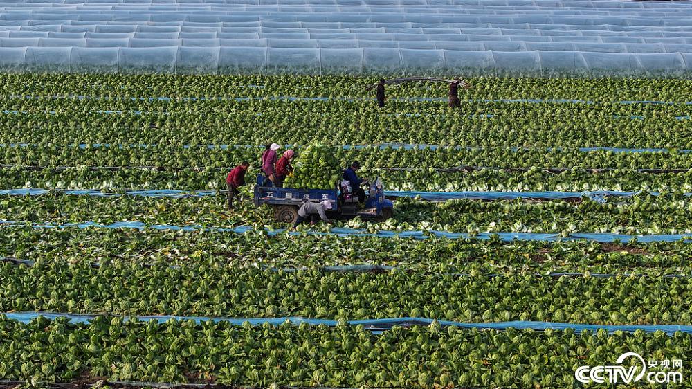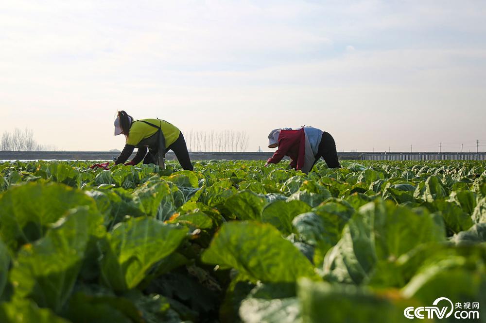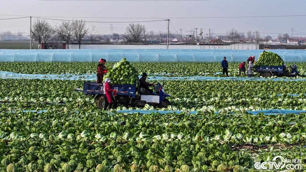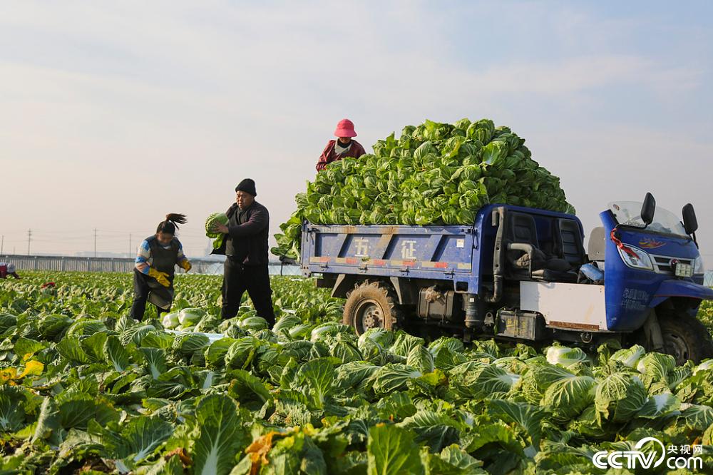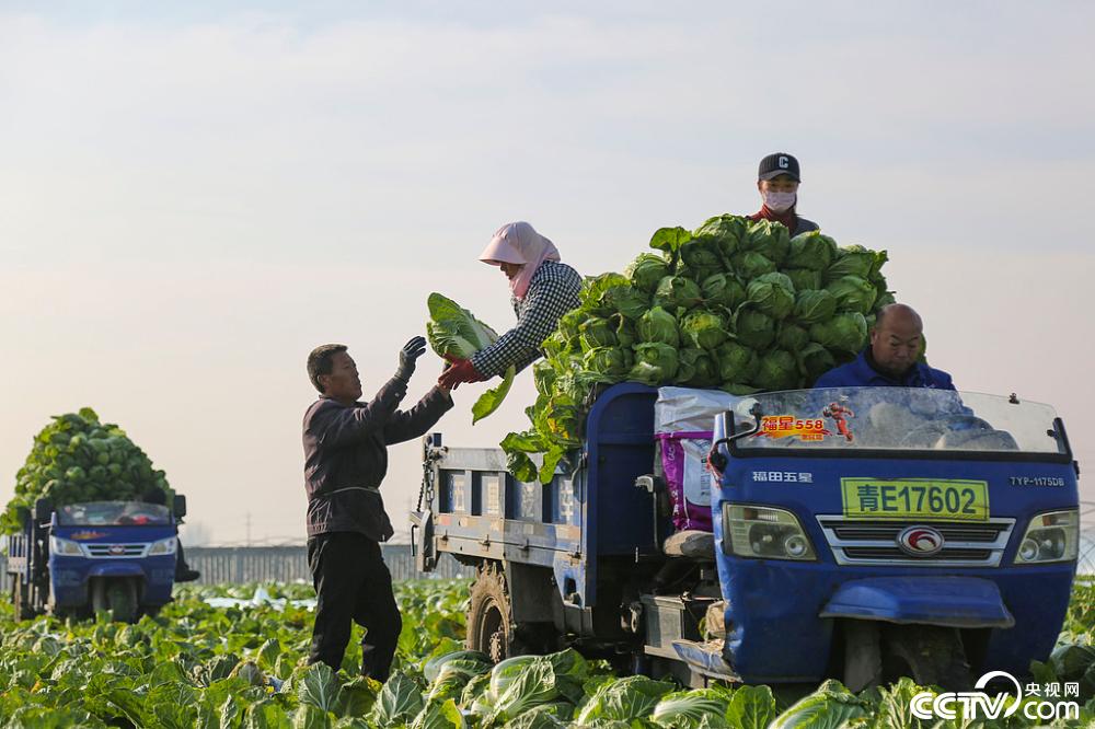 2025年12月18日,山東省東營市廣饒縣李鵲鎮太和三村的農田里,農民正在將收獲的白菜裝車。視覺中國