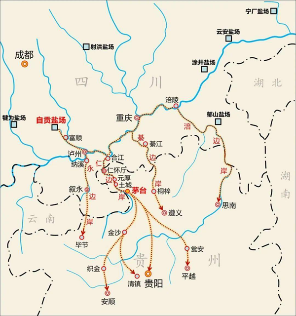 川鹽入黔的四條水道被劃分為永、仁、綦、涪四大口岸,其中“仁岸”憑借赤水河這條黃金水道,承擔了貴州三分之二的食鹽轉運任務。自貢鹽商紛紛在仁岸開設鹽號,如“協興隆”鹽號從仁懷到貴陽沿途設子號多達70余家。