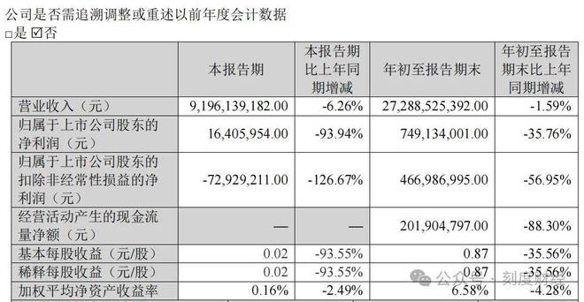 第三季度總營收91.96億元,同比下滑6.26%;歸母凈利潤為1640.60萬元,同比下滑93.94%。扣非凈利潤虧損7293萬元,同比擴大126.67%,主營業(yè)務盈利能力惡化。