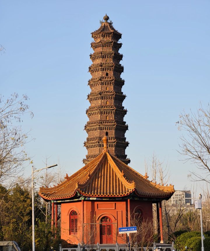開封鐵塔,本名開寶寺塔,塔建于北宋皇祐元年,是我國現存最早的一座大型琉璃建筑,琉璃呈褐色,似鐵銹,故稱鐵塔。上世紀戰爭時期曾遭嚴重破壞,大修,一些琉璃部件也多有增補。