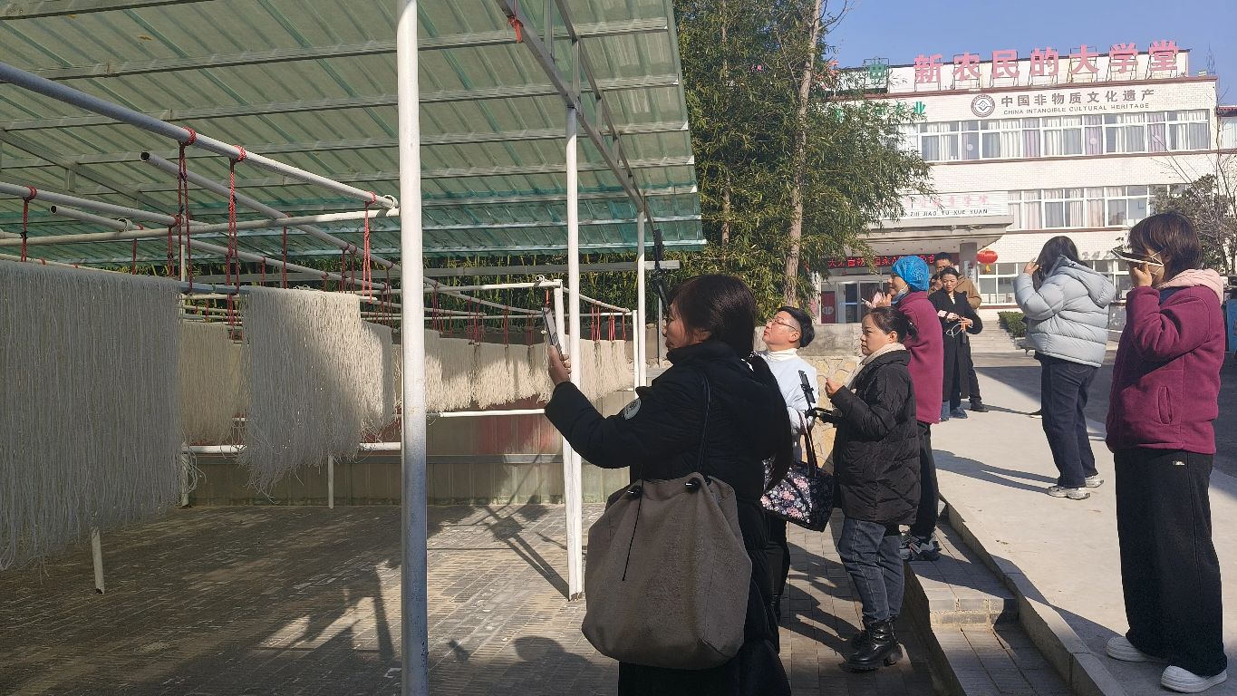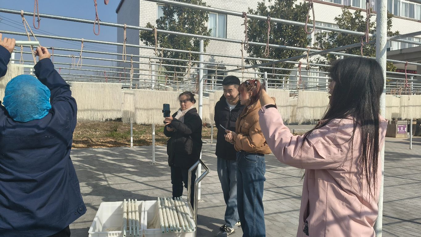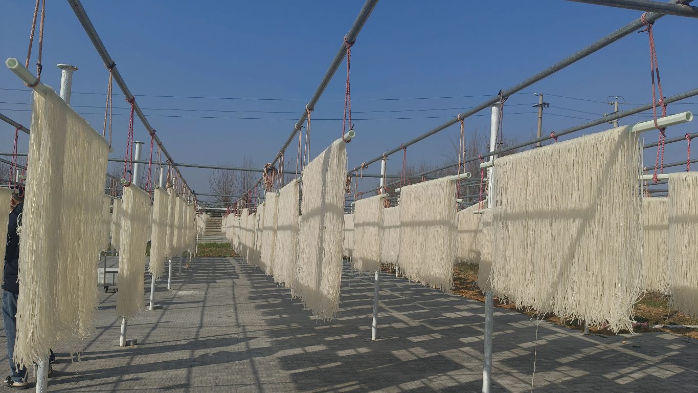 冬日暖陽,禹州市中華老字號盛田農業百年粉坊暖意融融,紅薯粉條晾曬場一片繁忙景象,干凈整潔的晾曬場掛著一排排晶瑩剔透的紅薯粉條,泛著誘人的銀輝,不僅勾勒出豐收的圖景,更吸引了眾多網紅慕名前來打卡直播。