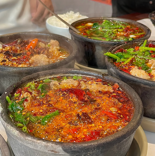 這是全場最精彩的時刻!在你摁好菜后,服務員會端著一大勺剛炸好的滾燙辣椒油,直接淋入砂鍋中。
