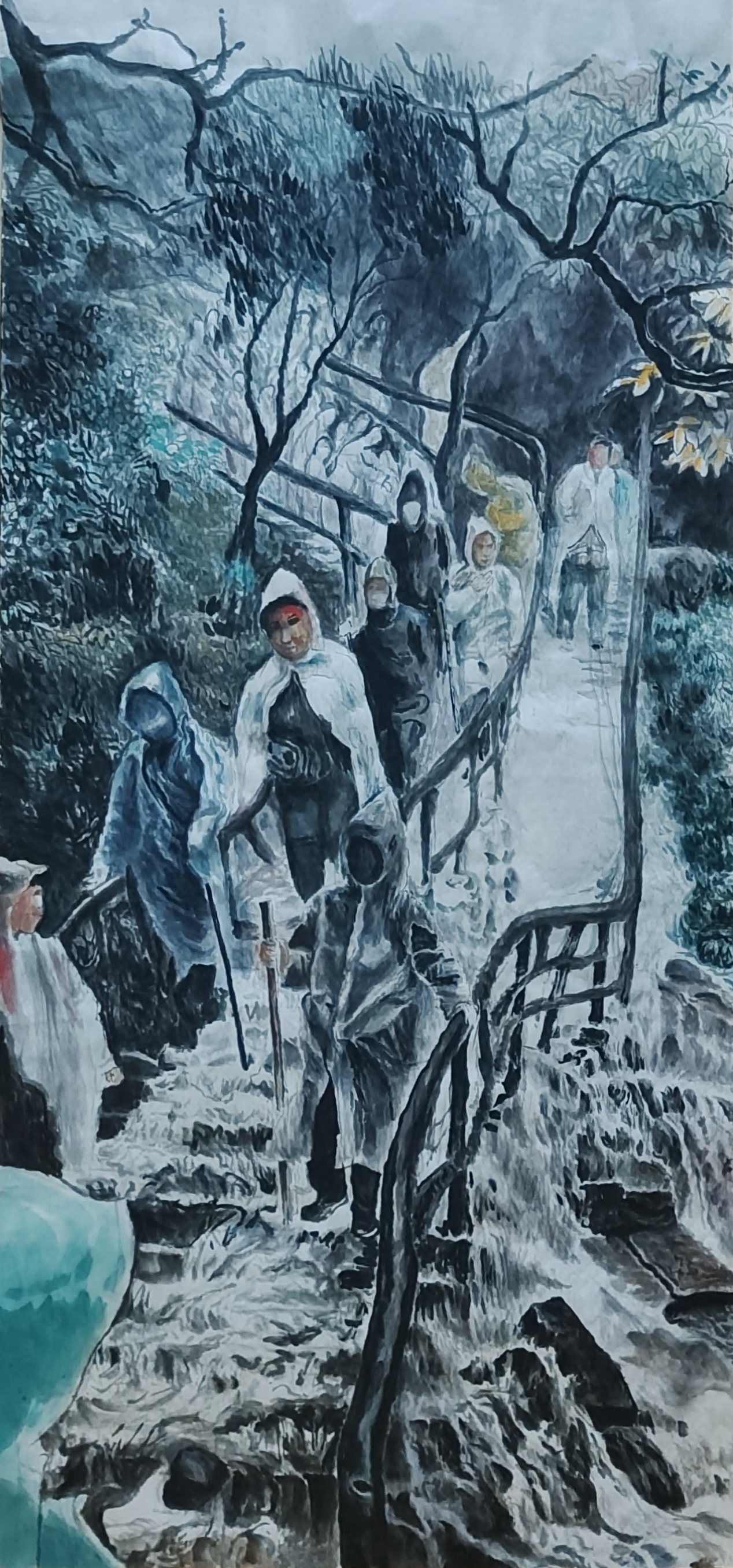 繪畫,商武斌手法多樣,路子很寬,視野很廣,而且,他又注重“外師造化,中得心源”的藝術(shù)理念,以萬物為賓客,搜妙創(chuàng)真,攬物于心。庭院清幽、野花盆景、山川溪流、松柏草木,他都能入畫,街頭巷談、轉(zhuǎn)目私語、取諸懷抱、因寄所托,他也都能融入詩。當畫與詩與心,融為精妙,他的山水高遠之勢突兀,深遠之意沖融,平遠之境飄渺;他的人物一嗔一憂一喜,神情與心態(tài)絲絲入扣;他的禽鳥,低昂有意,顧盼有情,神形兼?zhèn)洌糁觥?/p>