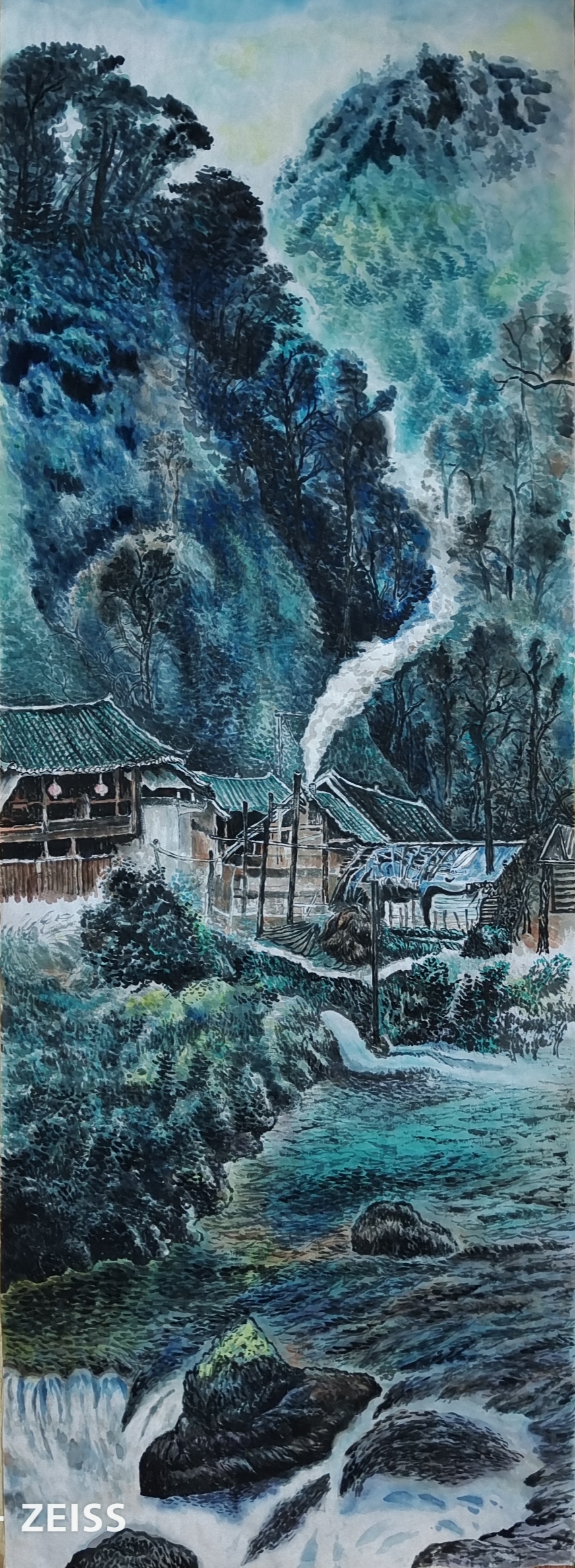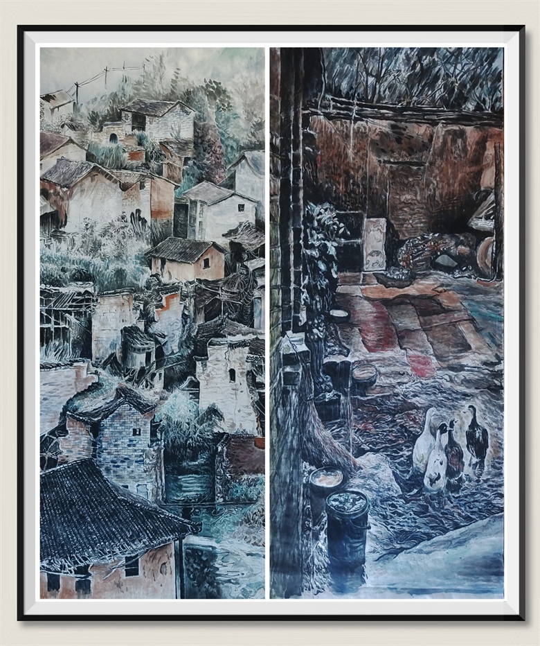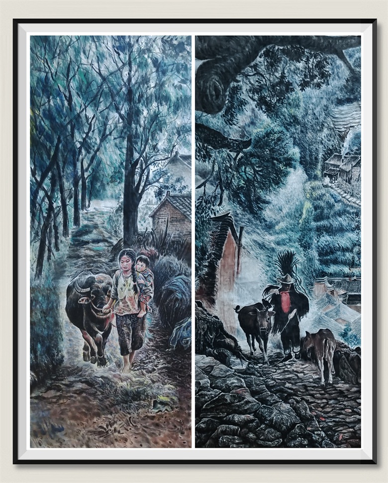 當然,商武斌也在山水中,畫人物、禽鳥、走獸,以及村莊一角、院落民宅,一切皆能入畫,冒著煙火氣,熱氣騰騰,觀之入心,品之有味,可覽、可游、可品讀,仿佛還可以借此下酒。