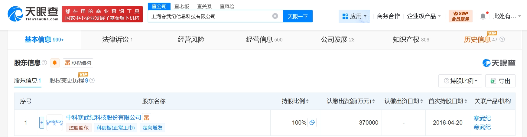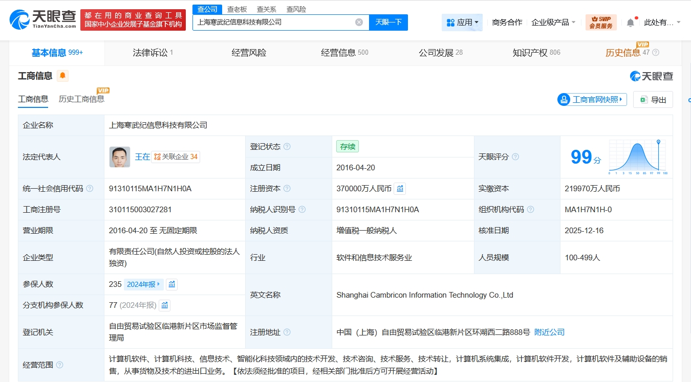 該公司成立于2016年4月,法定代表人為王在,經營范圍為計算機軟件、計算機科技、信息技術、智能化科技領域內的技術開發、技術咨詢、技術服務、技術轉讓,計算機系統集成,計算機軟件開發,計算機軟件及輔助設備的銷售,從事貨物及技術的進出口業務。股東信息顯示,該公司由寒武紀(688256)全資持股。
