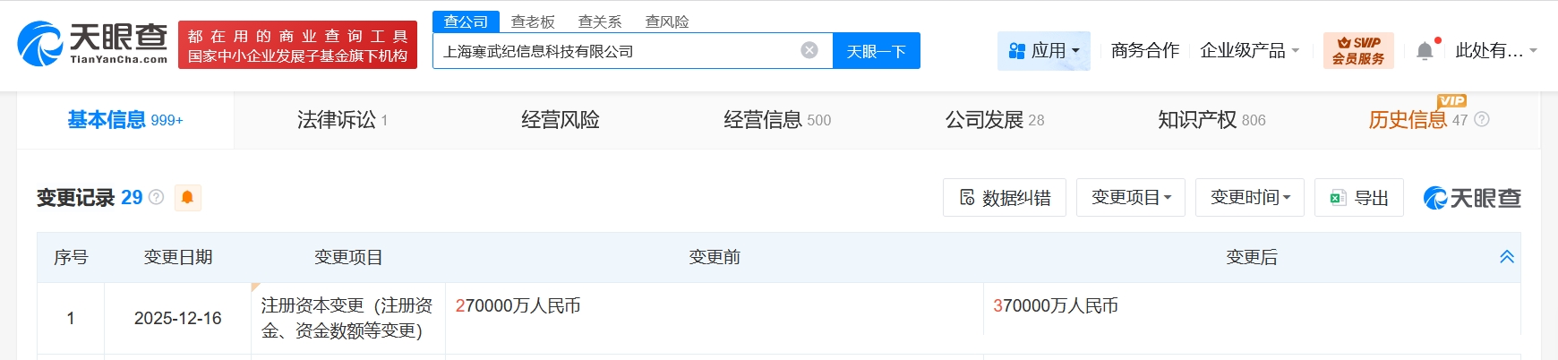 天眼查App顯示,近日,上海寒武紀信息科技有限公司發生工商變更,注冊資本由27億人民幣增至37億人民幣,增幅約37%…