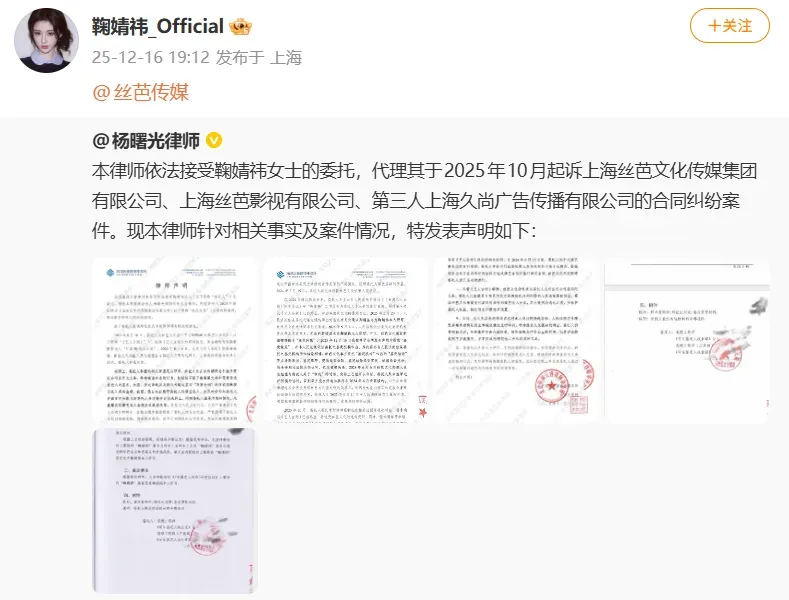 12月18日,據白鹿視頻報道,絲芭傳媒發文“致藝人鞠婧祎的最后告知”。