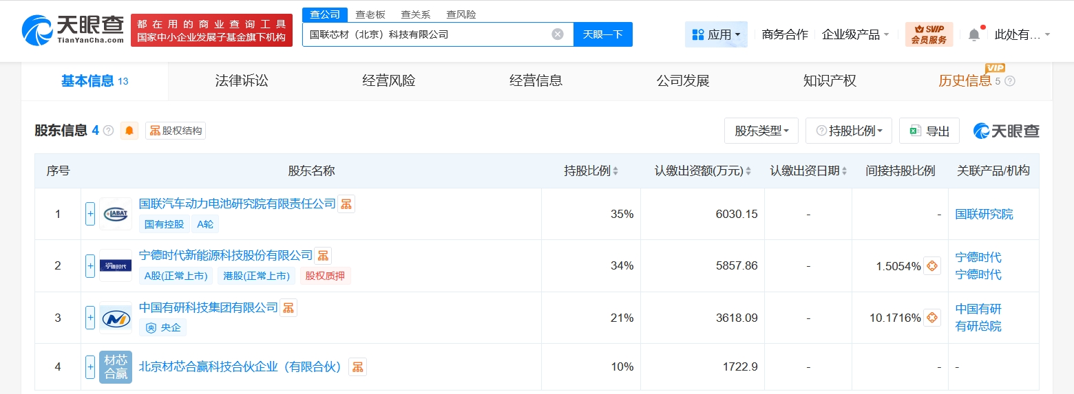 雷達財經訊,天眼查工商信息顯示,近日,國聯芯材(北京)科技有限公司成立,法定代表人為趙尚騫,注冊資本約1.7億人民幣,經營范圍含電子專用材料研發、電子專用設備制造、電子專用設備銷售、新材料技術研發、新材料技術推廣服務、工程和技術研究和試驗發展、電池銷售、新興能源技術研發、信息咨詢服務等。股東信息顯示,該公司由國聯汽車動力電池研究院有限責任公司、寧德時代(300750)、中國有研科技集團有限公司、北京材芯合贏科技合伙企業(有限合伙)共同持股。