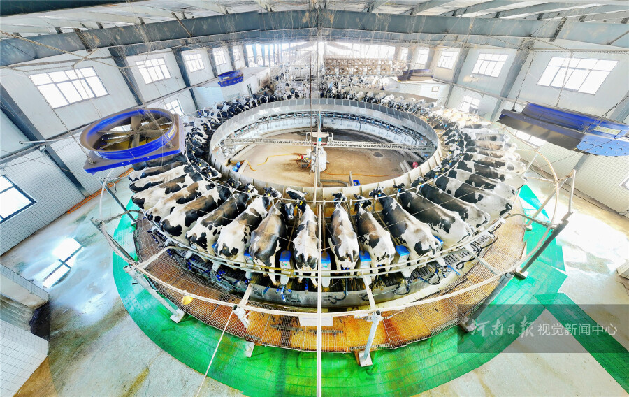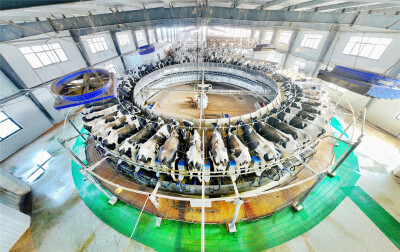 而在擠奶大廳里,智能化圓形擠奶轉盤上,一頭頭奶牛開始了自動化擠奶,約10分鐘后擠奶器自動脫落,完成“任務”的奶牛走下轉盤。鮮奶通過管道進入罐裝車,經過低溫殺菌后就立即“奔向”洛陽科迪巨爾乳業、湖南新希望南山液態乳業等目的地。