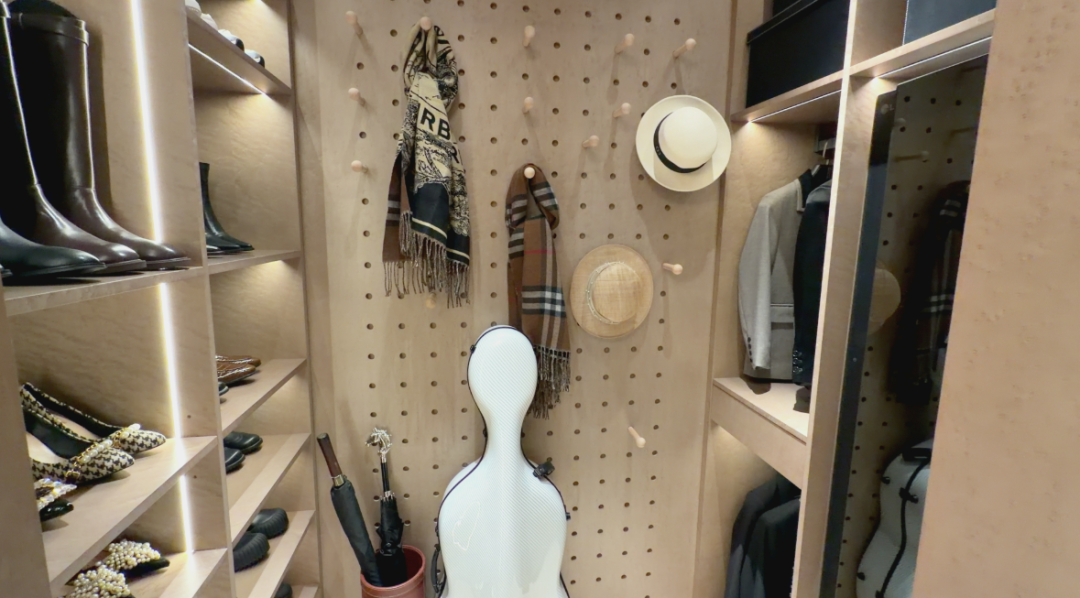 收納系統則實現全空間覆蓋,375㎡戶型的玄關鞋柜可容納32雙鞋,主臥衣柜細分掛衣區、飾品區甚至行李箱區,所有衣柜均以成品交付,配備百隆電動升降掛衣桿,省去了高端住宅后期定制的麻煩。