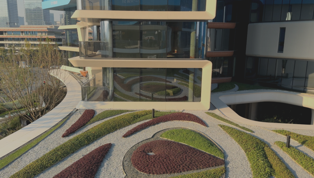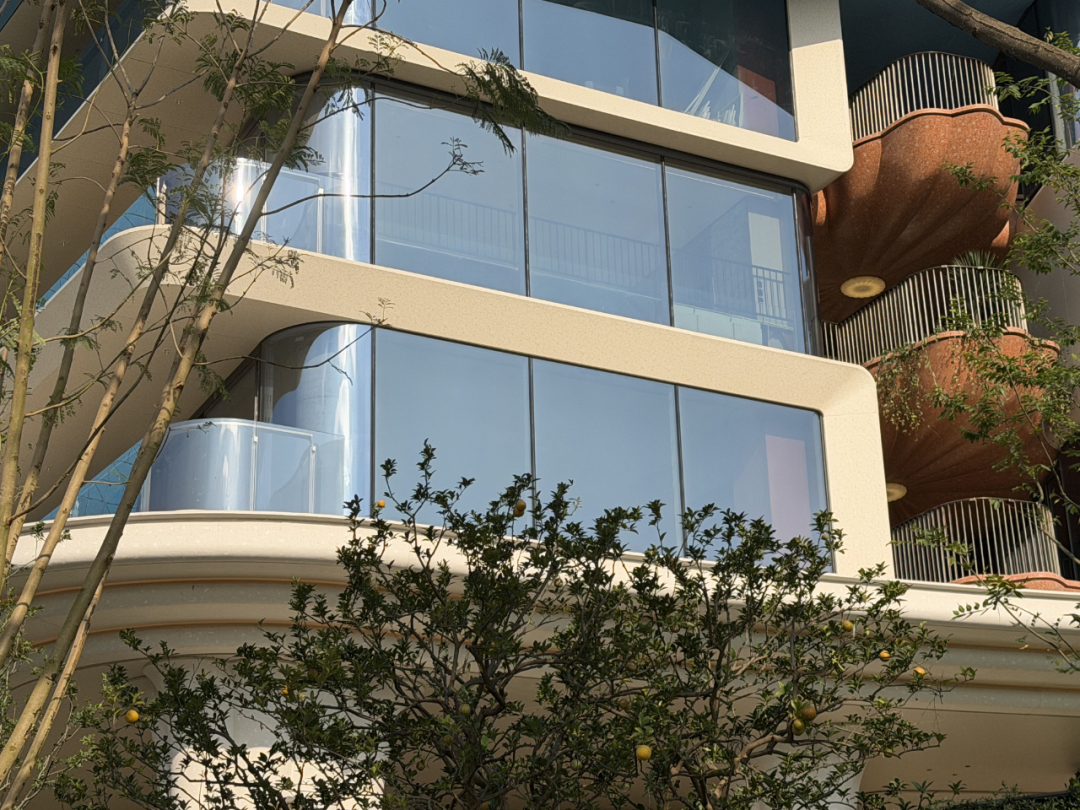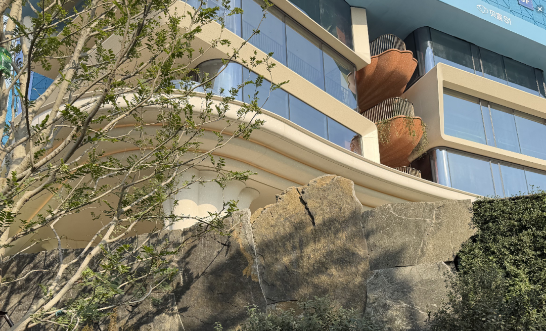 暖灰色雙曲蜂窩鋁板包裹建筑主體,同款圓角曲線與極窄邊框,讓硬朗的建筑線條變得溫潤柔和。