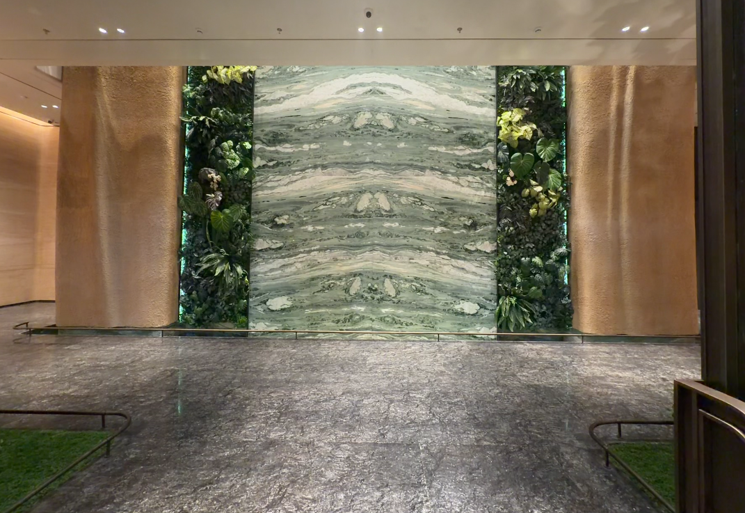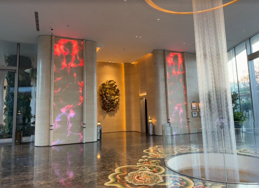 從立面到室內,S1做了大量的曲面設計。大堂墻面用的數字化石材,在石材的內里嵌入精密電元器件。