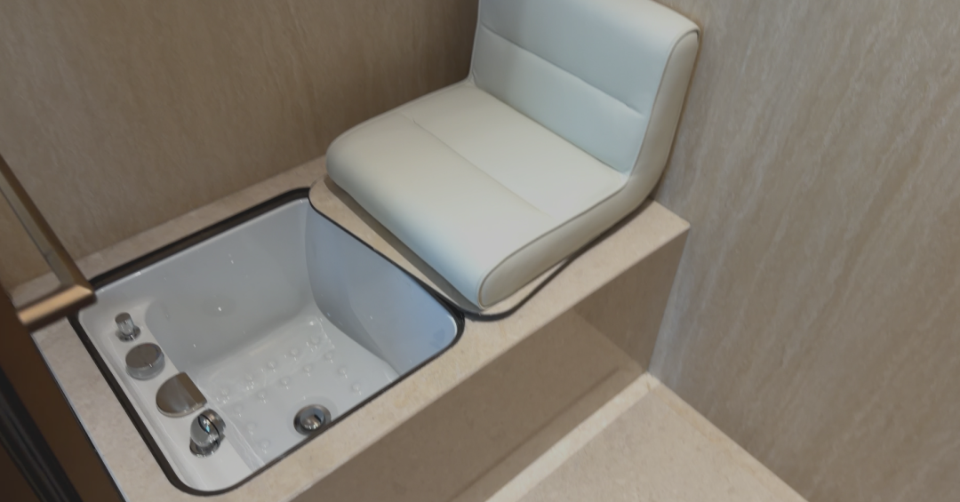 比如長輩房里,40cm深的定制泡腳池自帶恒溫龍頭,旁邊的儲物柜專門預留洗腳盆、毛巾的存放空間,這種貼合長輩生活習慣的設計,還是下了功夫的。