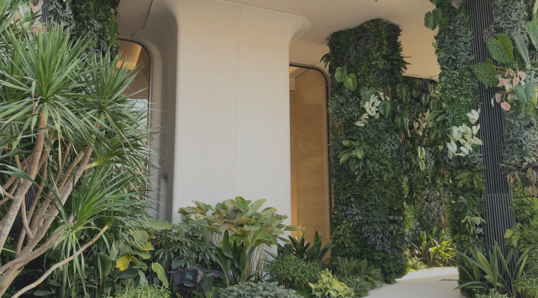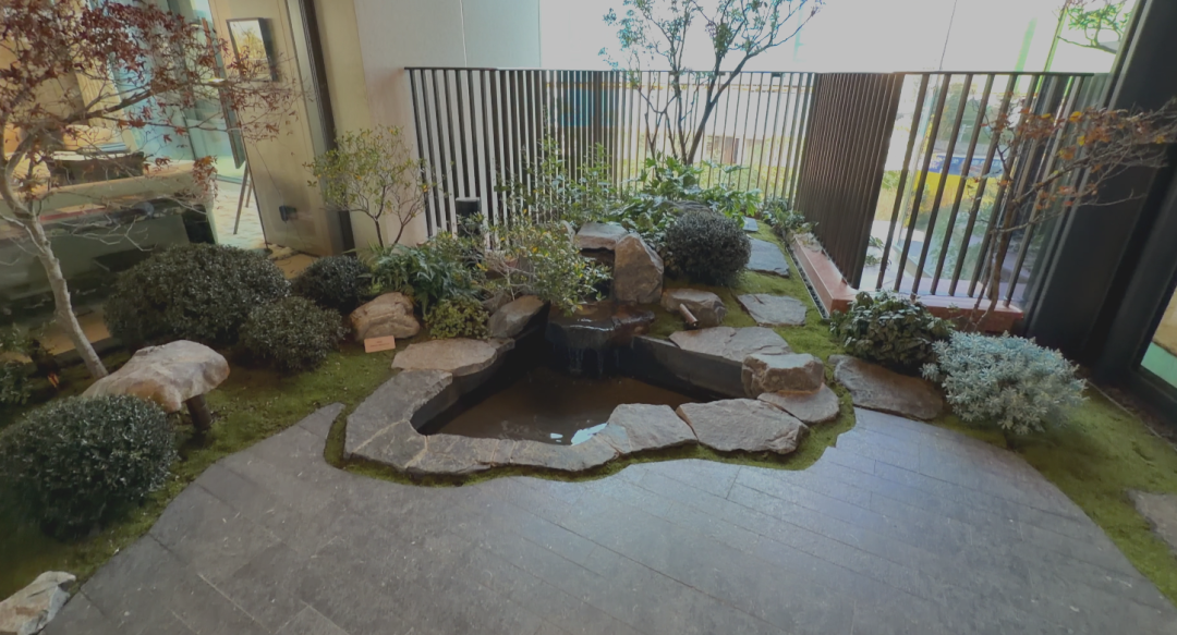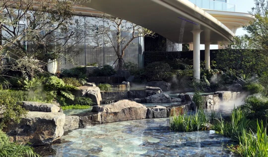 貝宸S1的景觀設計,摒棄了名貴樹種堆砌的豪宅套路,將本土植物與實用功能深度結合。從歸家前庭外開始,就做了水景和綠植。