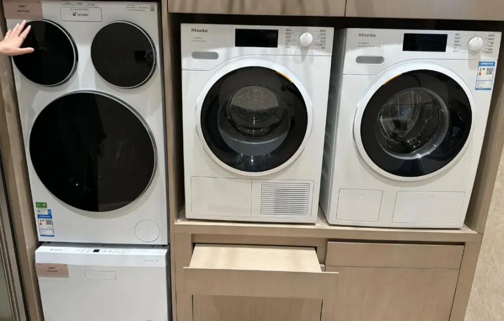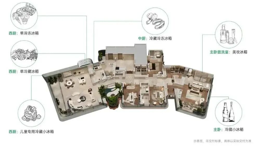 一套房子里有6臺冰箱,其中一臺是專門適合兒童拿東西的兒童冰箱,兩臺多功能洗衣機(一臺洗衣機可以同時分區洗衣服、內衣、襪子)、一臺洗鞋機、烘干機,還預留了其他點位可以再裝兩臺洗衣機。